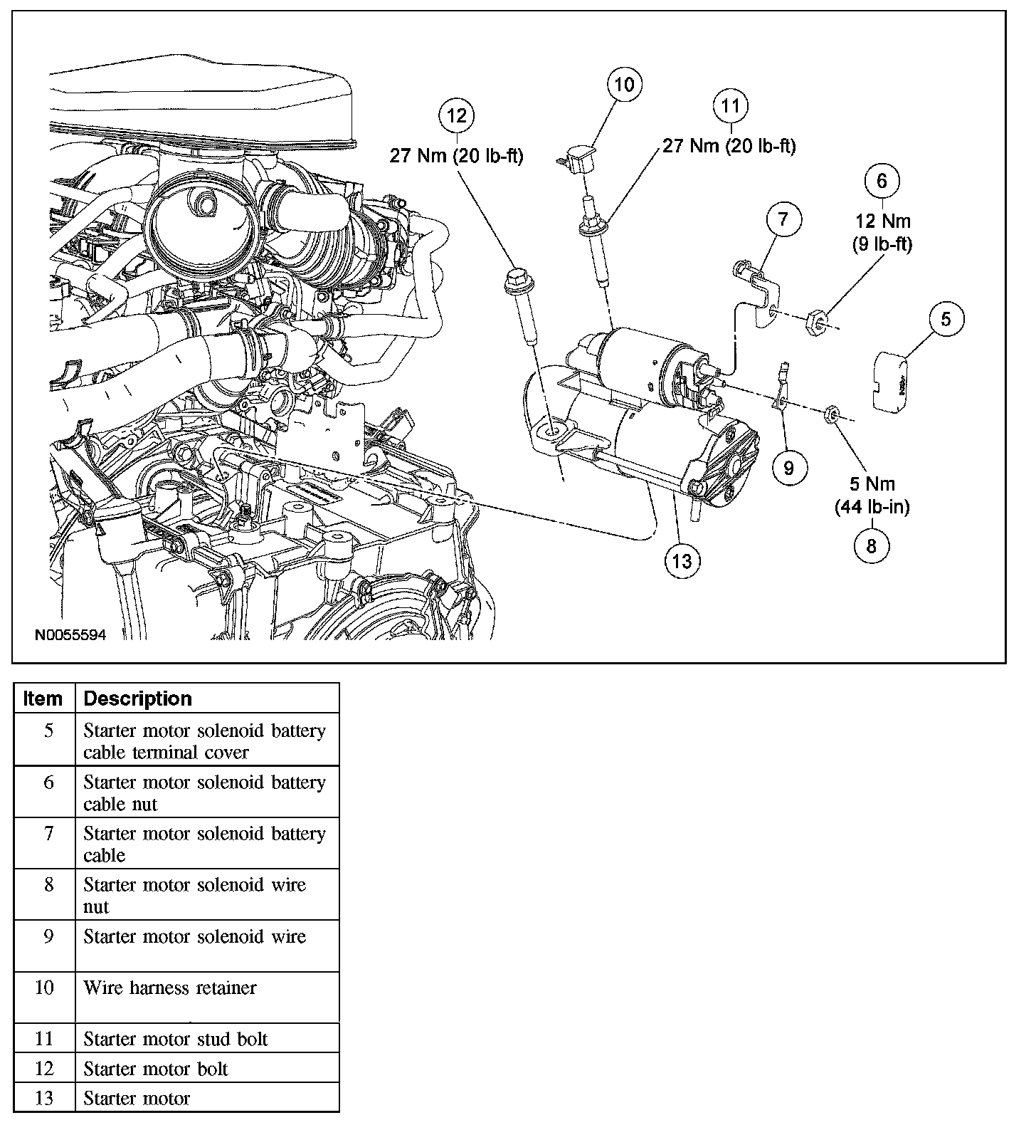 9. Disconnect the wiring harness retainer from the starter motor stud bolt and position the wiring harness aside.