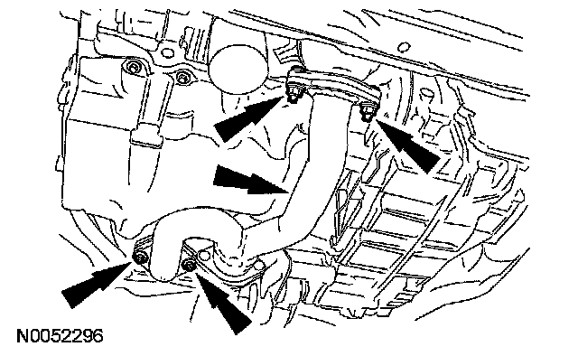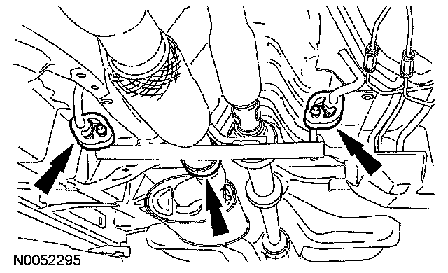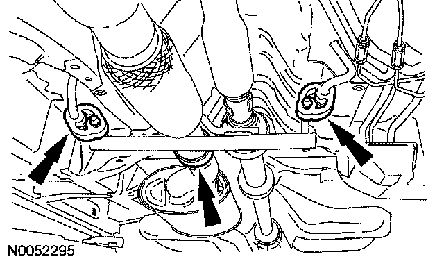 18. Lower the jack until the transmission fluid cooler tube clears the lower transmission support insulator bolts.