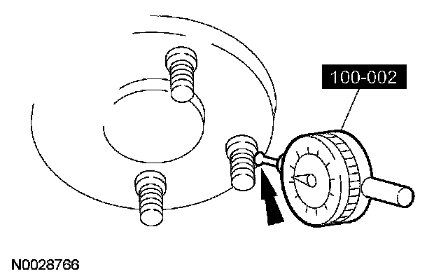 2. Rotate the hub until the next bolt is contacted. Record the measurement and continue until each bolt is checked. The difference between the maximum and minimum contact readings is the total wheel hub flange bolt circle runout. The runout must not exceed 0.38 mm (0.015 inch).