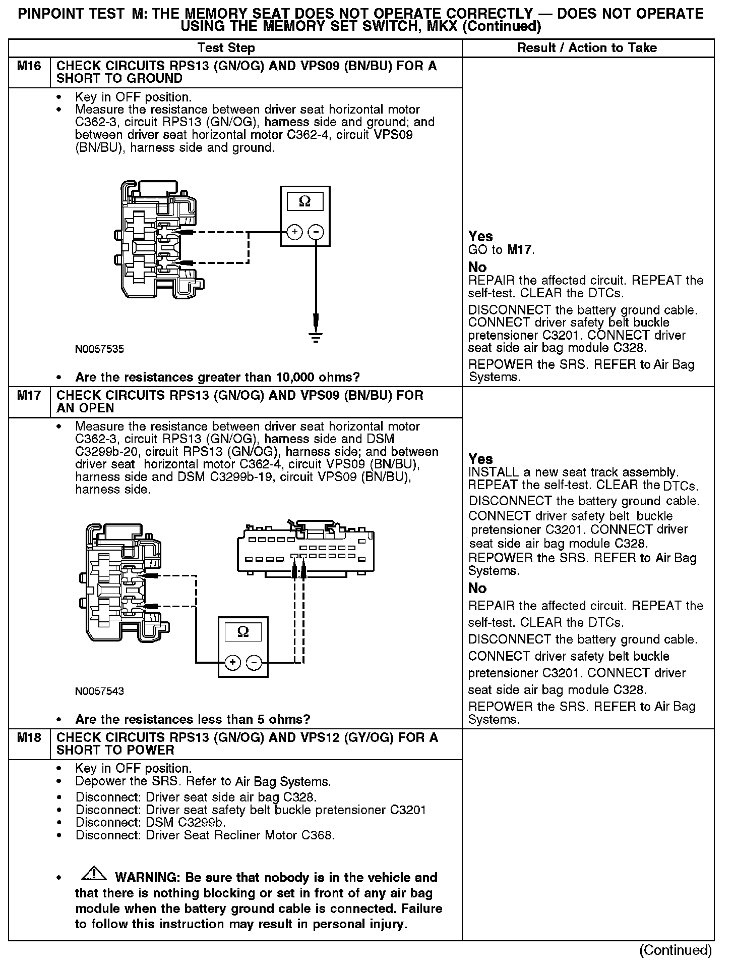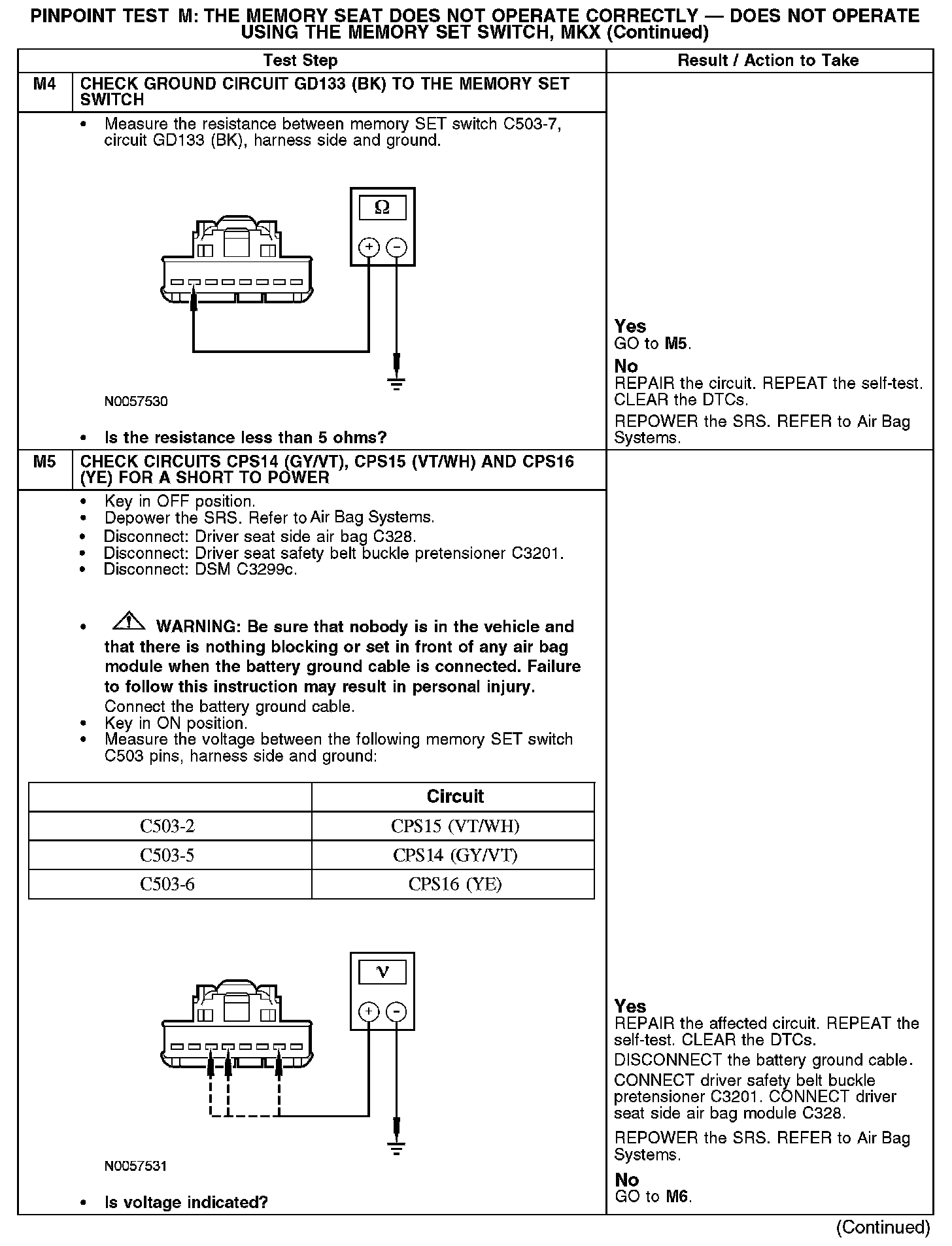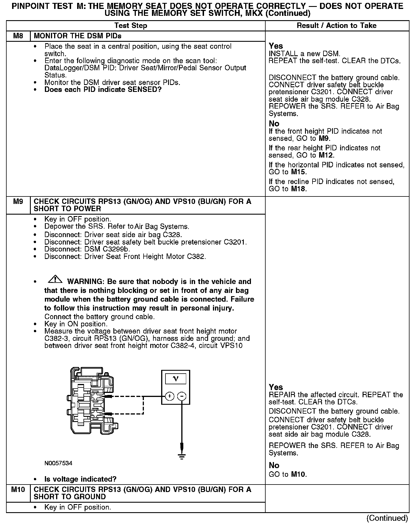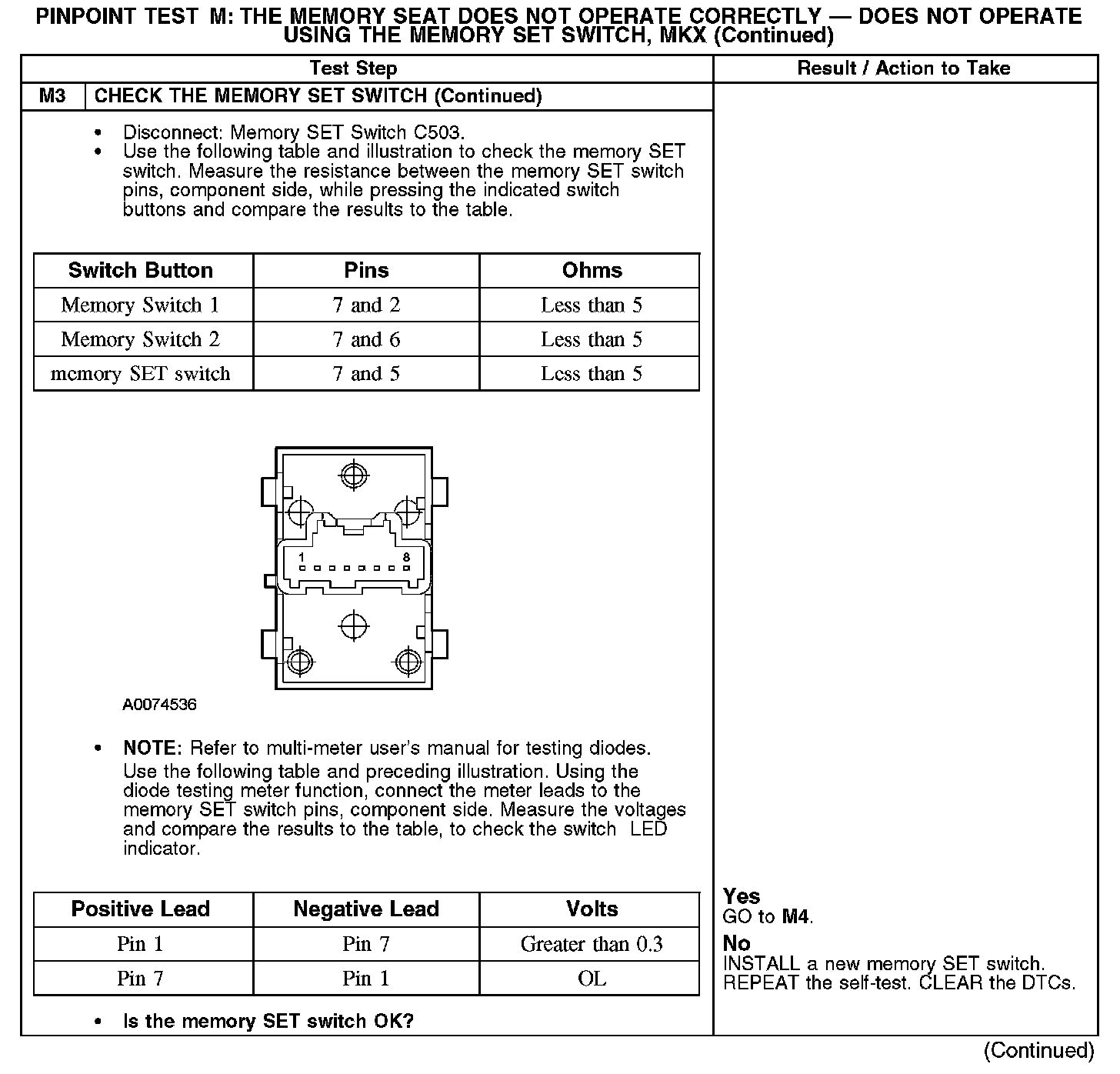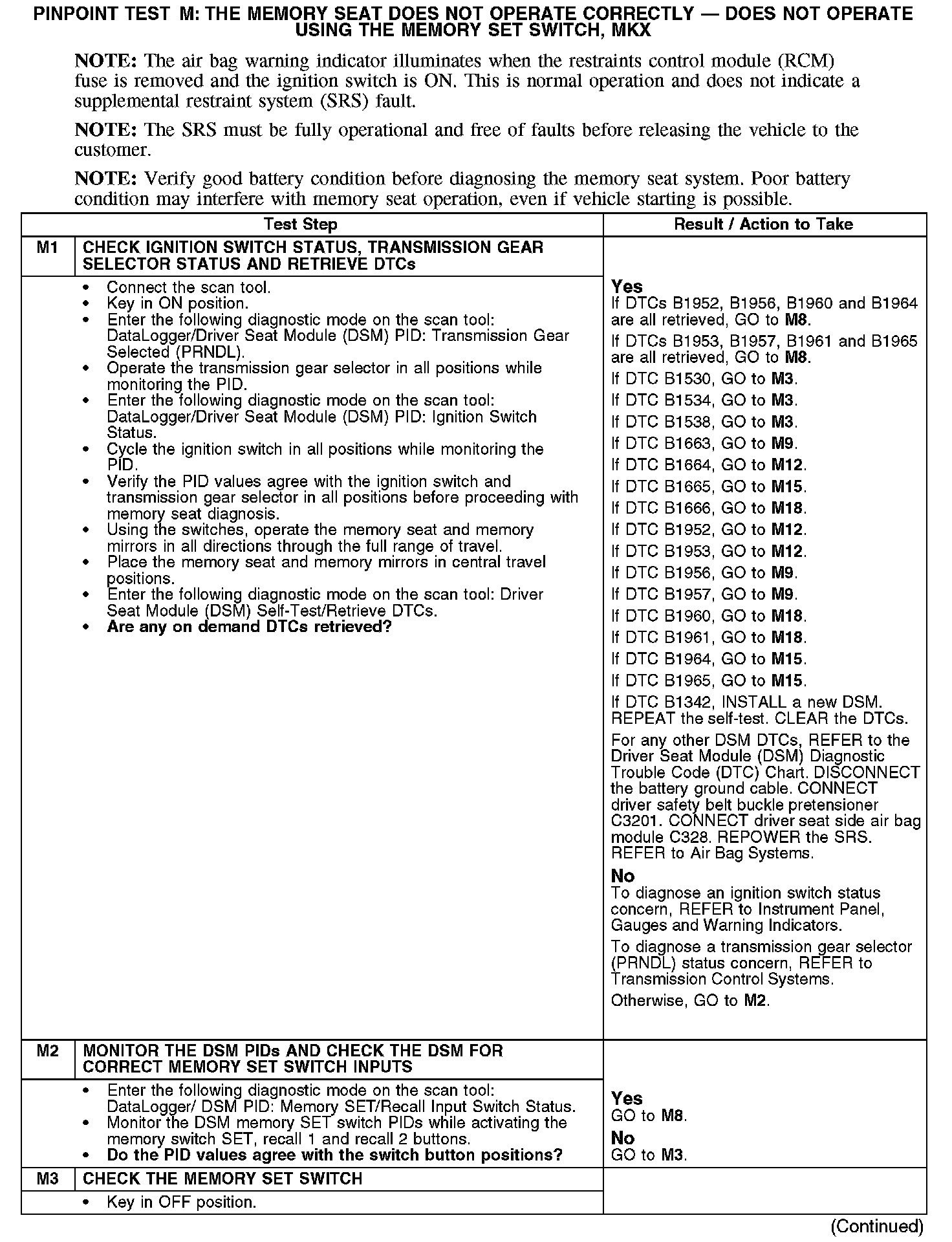 PINPOINT TEST M: THE MEMORY SEAT DOES NOT OPERATE CORRECTLY - DOES NOT OPERATE USING THE MEMORY SET SWITCH, MKXM1-M3: