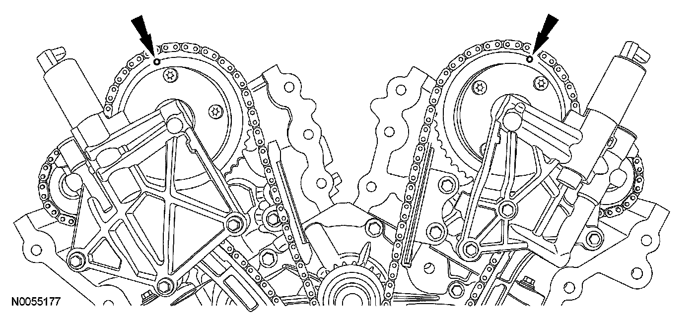 2. Rotate the crankshaft clockwise and align the timing marks on the variable camshaft timing (VCT) assemblies as shown.
