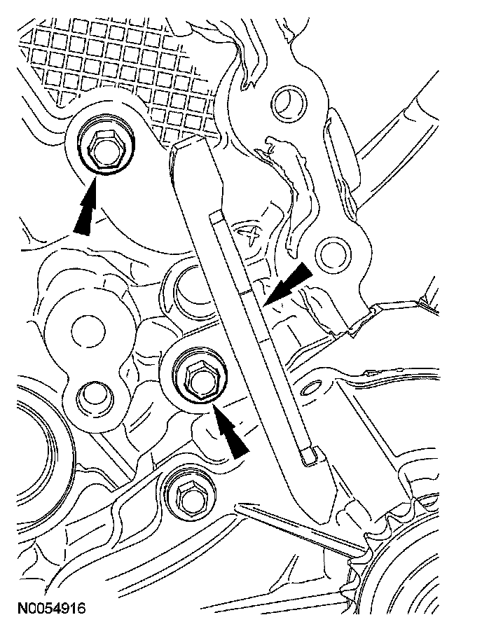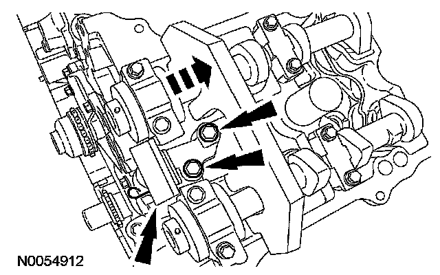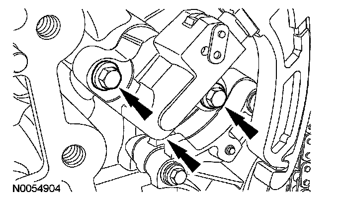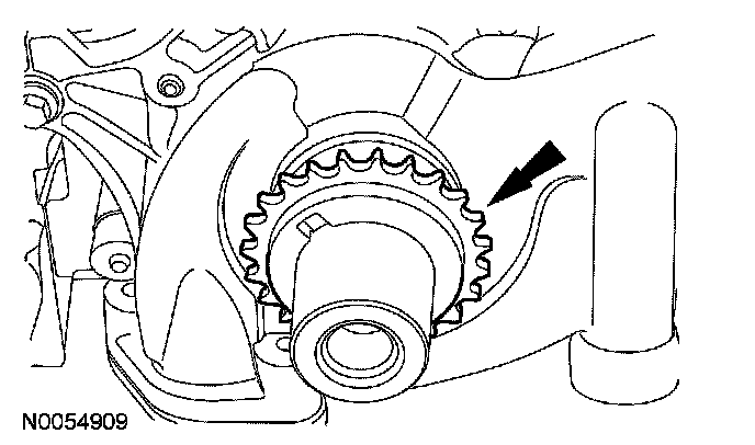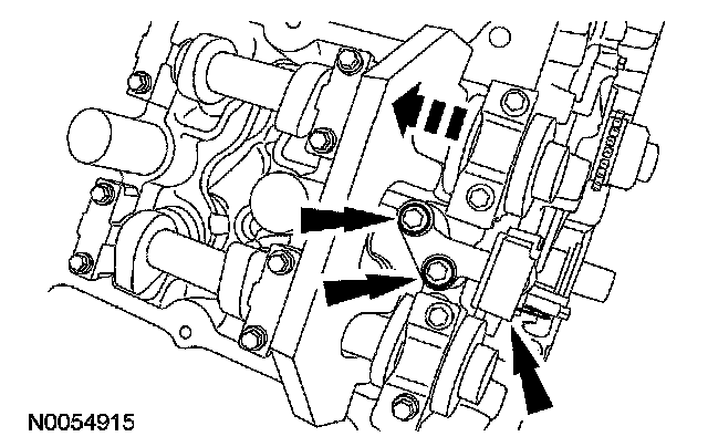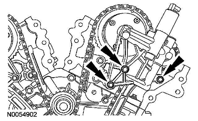 18. NOTE: The VCT bolt and the exhaust camshaft bolt must be discarded and new ones installed. However, the exhaust camshaft washer is reusable.