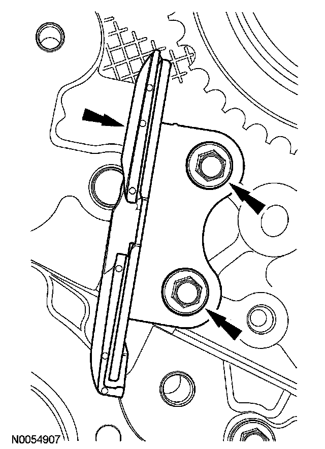 10. Remove the 2 bolts and the lower LH primary timing chain guide.