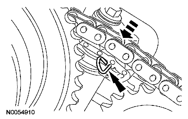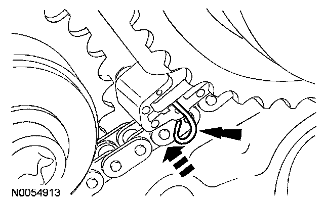 14. Compress the LH secondary timing chain tensioner and install a suitable lockpin to retain the tensioner in the collapsed position.