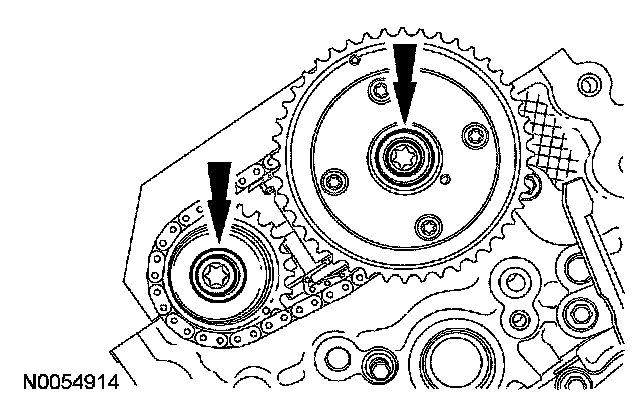 15. NOTE: The VCT bolt and the exhaust camshaft bolt must be discarded and new ones installed. However, the exhaust camshaft washer is reusable.