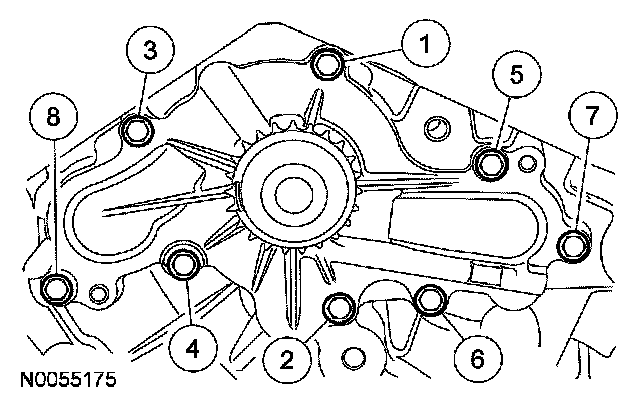 Install the coolant pump and the 8 bolts.