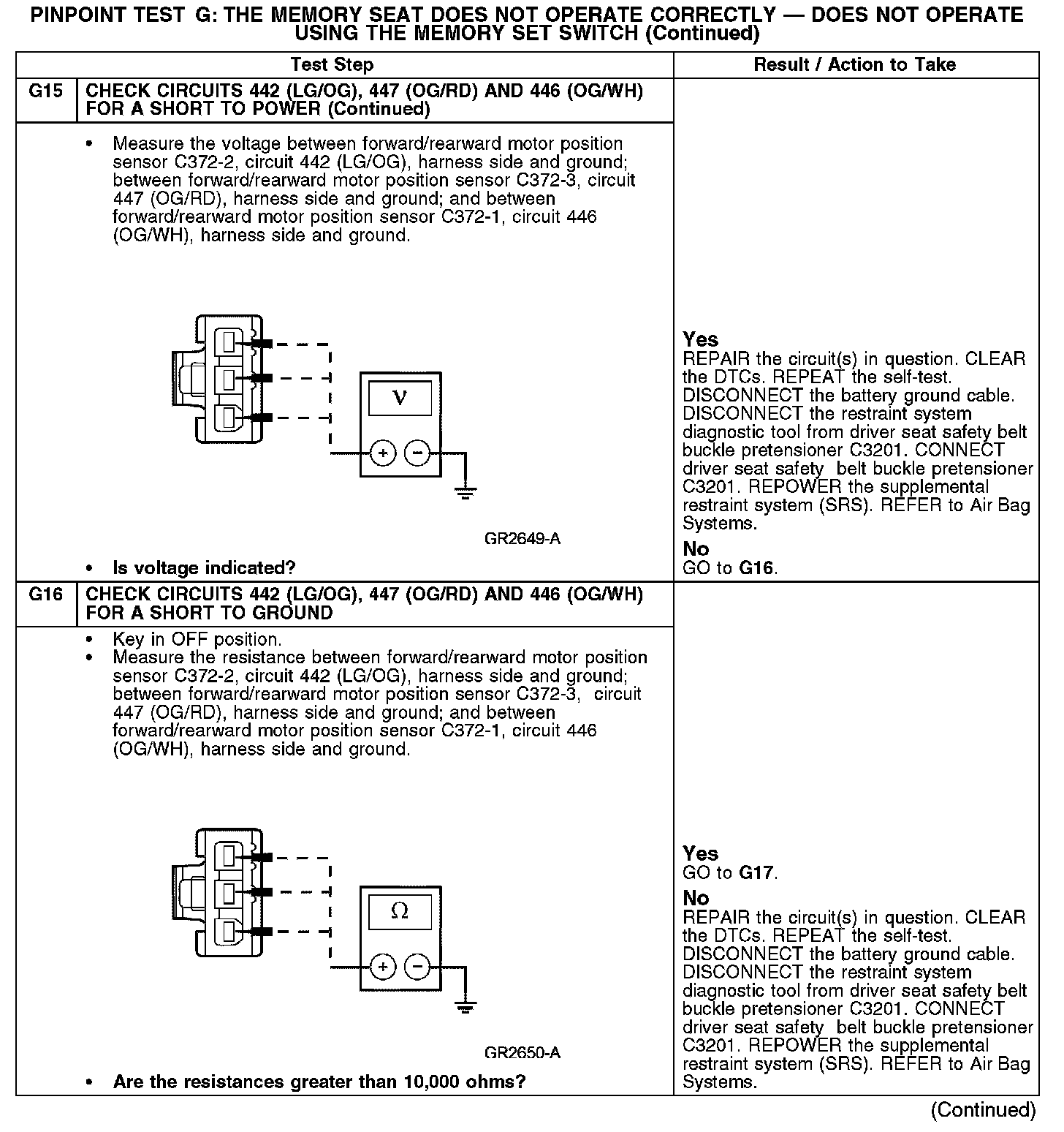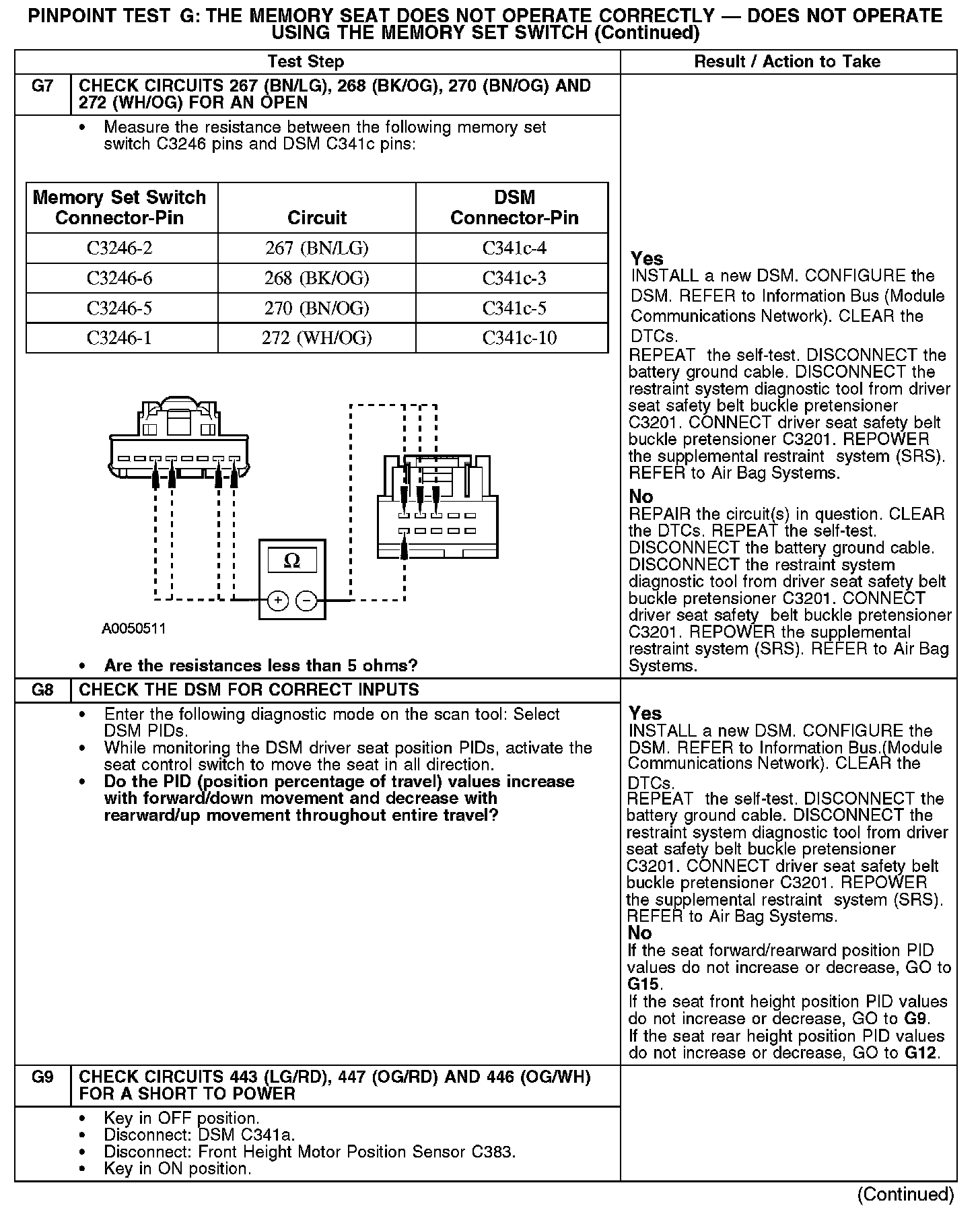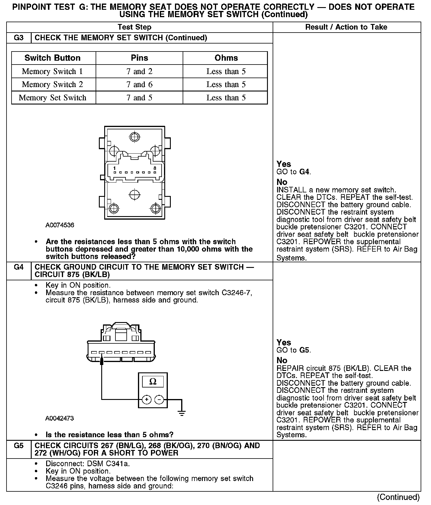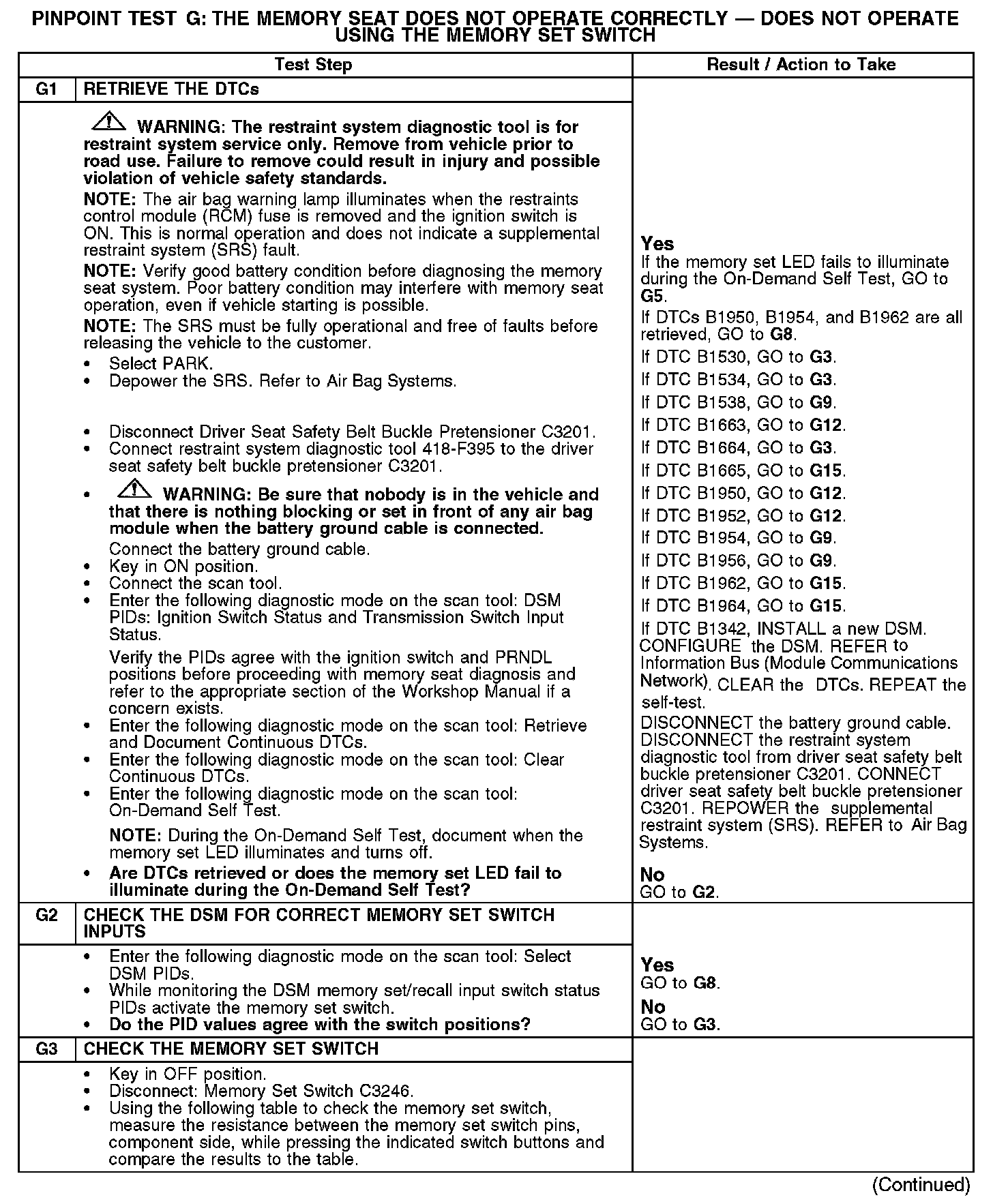 PINPOINT TEST G: THE MEMORY SEAT DOES NOT OPERATE CORRECTLY - DOES NOT OPERATE USING THE MEMORY SET SWITCHG1-G3: