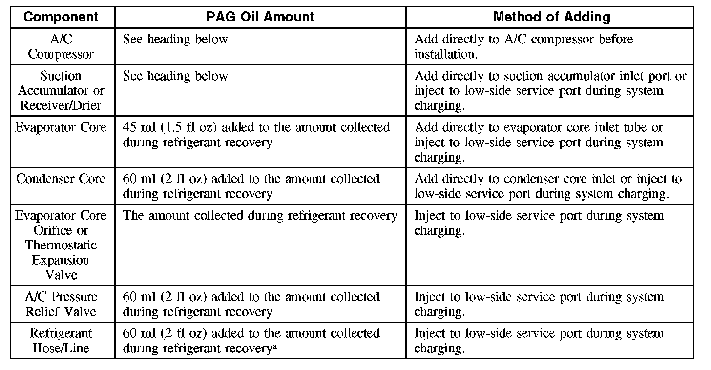 CAUTION: During normal A/C operation, oil is circulated through the system with the refrigerant, and a small amount is retained in each component. If certain components of the system are removed, some of the refrigerant oil will go with the component. To maintain the original total oil charge, it is necessary to compensate for the oil lost by adding oil to the system with the new part.