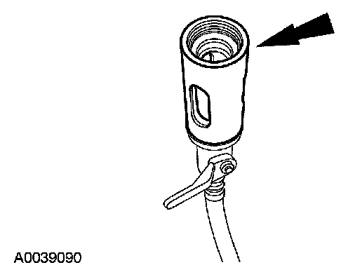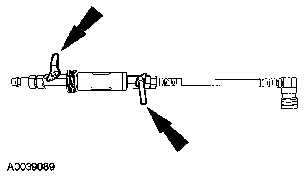 5. Install the dye/lubricant injector between the low-side service gauge port valve and the refrigerant service station or manifold gauge set.