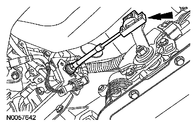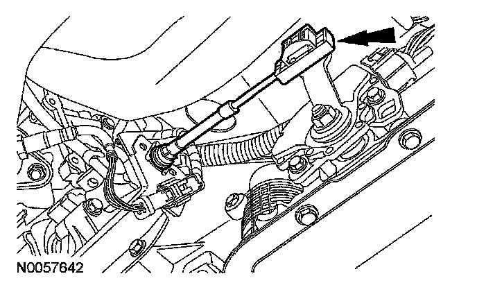 6. NOTE: When installing the selector lever cable, make sure that the selector lever cable locking tabs are locked in place and the cable end is snapped onto the ball stud. Press the selector lever cable into the bracket and listen for the cable to click in place. Pull back on the selector lever cable to make sure that it is locked into the bracket. Also make sure that the selector lever cable end is correctly installed onto the ball stud. Pull back on the selector lever cable end to make sure that the cable end is correctly installed.