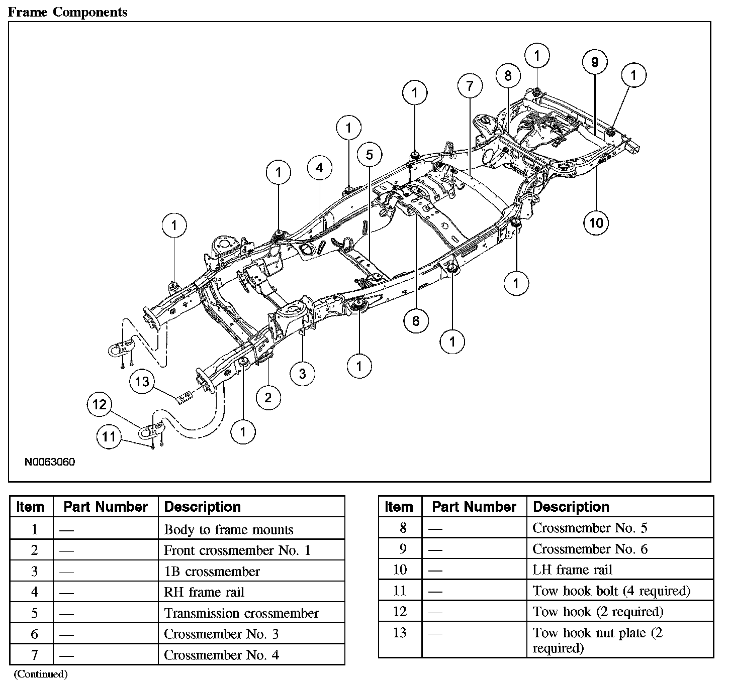 The frame is made up of 2 steel boxed side rails and crossmembers, which are welded to the 2 side rails. The transmission crossmember is bolted to the side rails. The side welded rails and crossmembers are not replaced separately.