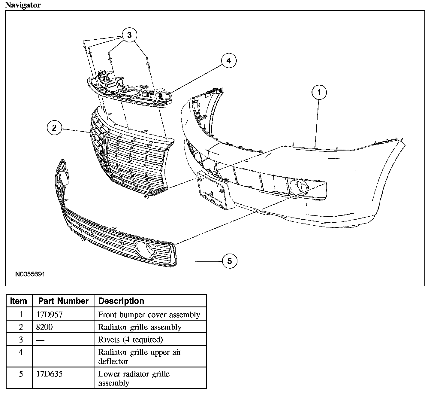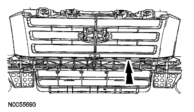 2. Remove the 4 bumper assembly-to-grille bracket retainer nuts and the bumper assembly-to-grille bracket.