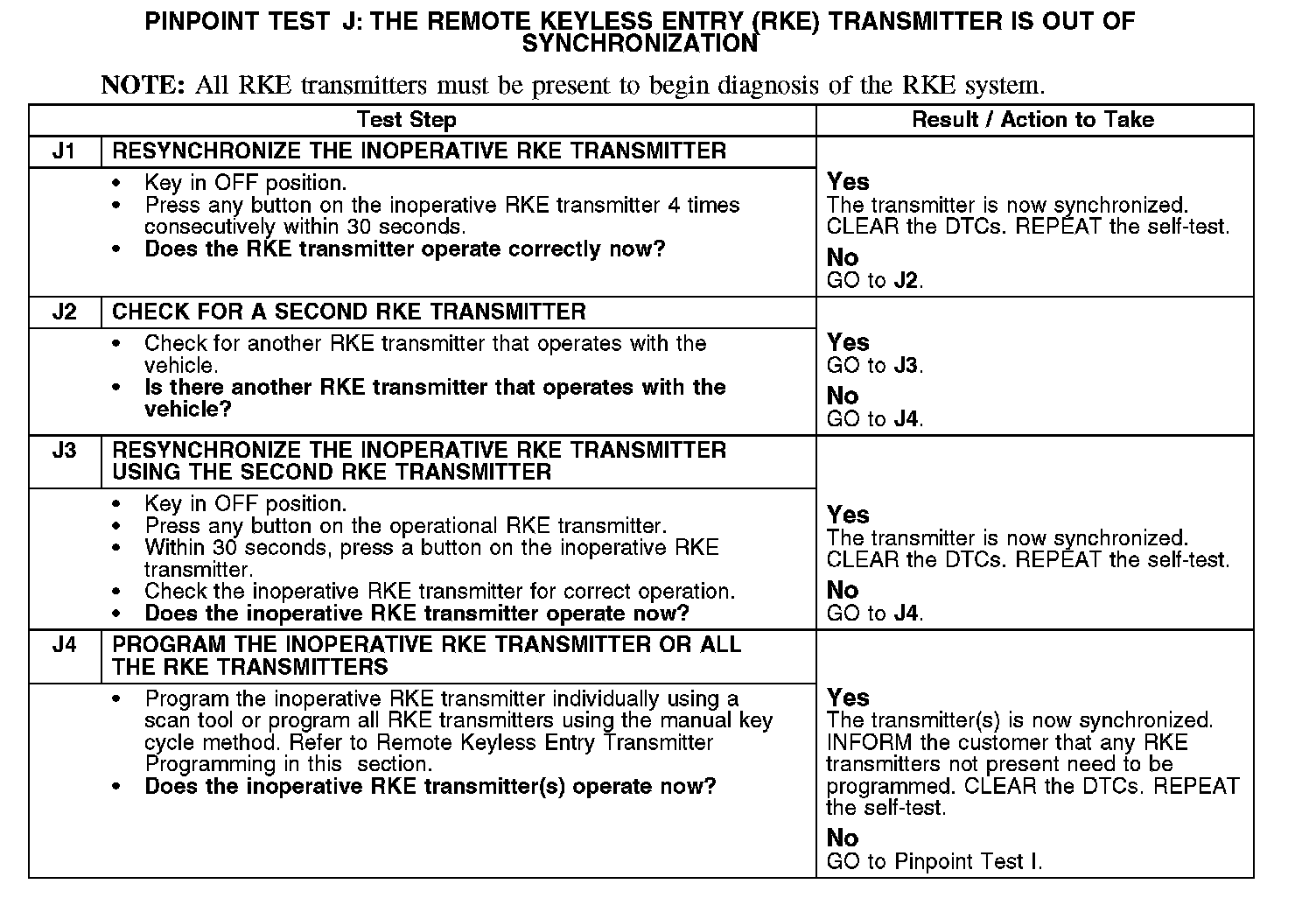 PINPOINT TEST J: THE REMOTE KEYLESS ENTRY (RKE) TRANSMITTER IS OUT OF SYNCHRONIZATIONJ1-J4:
