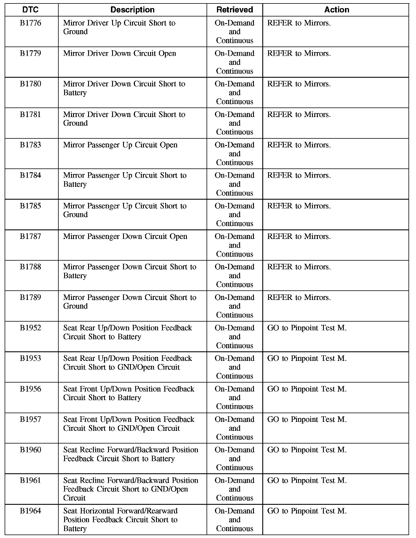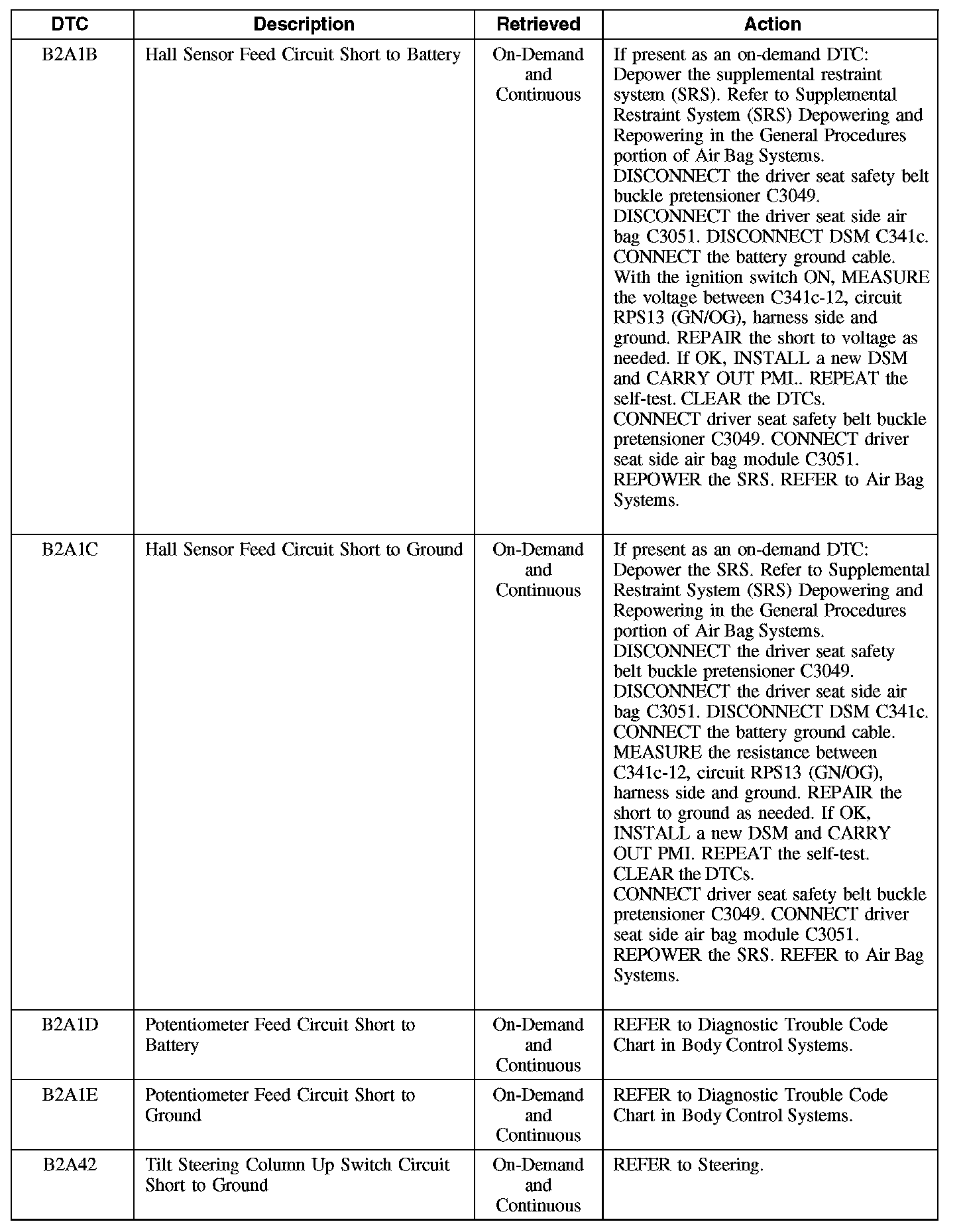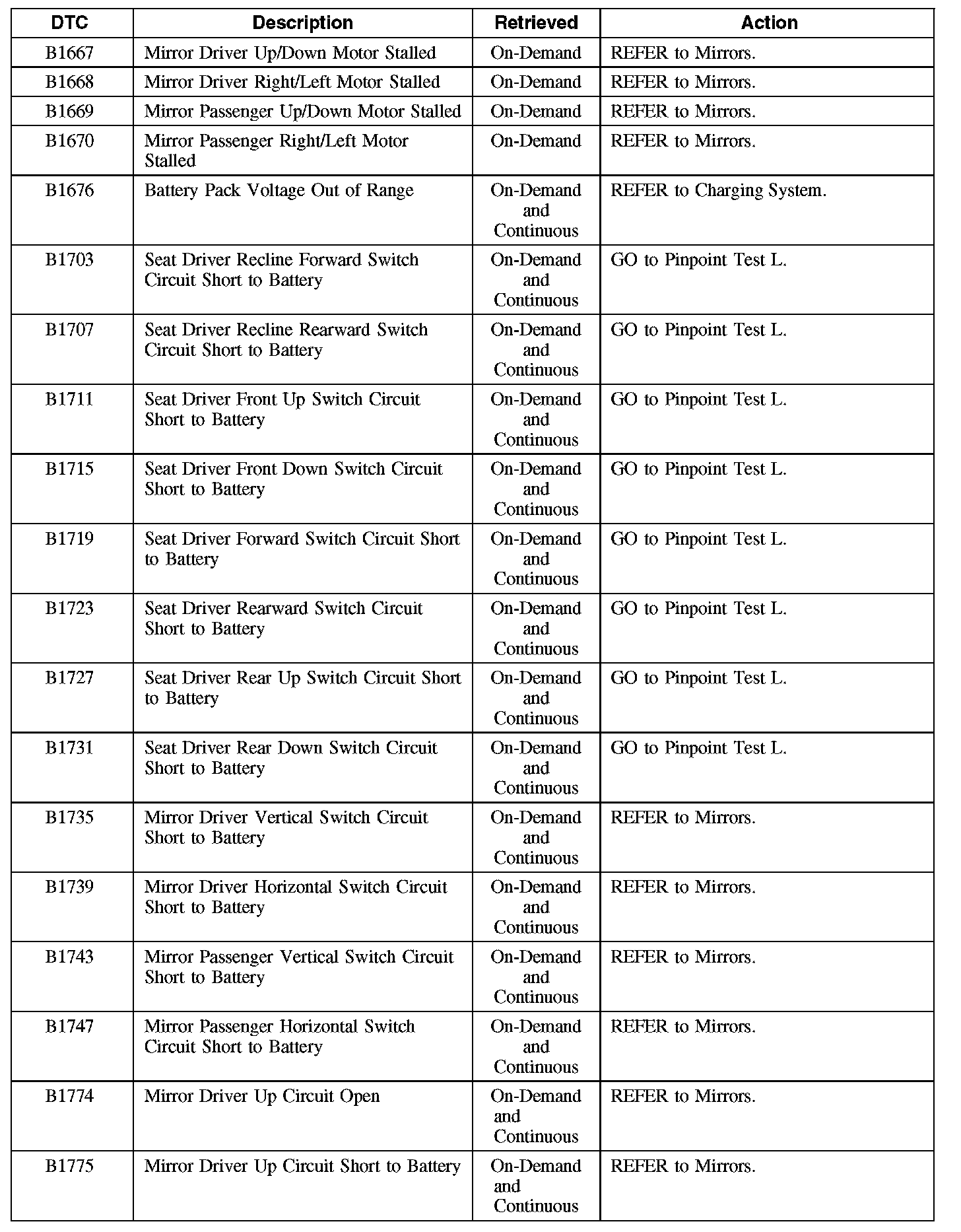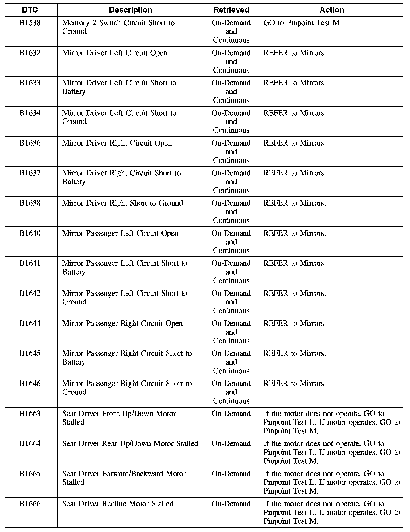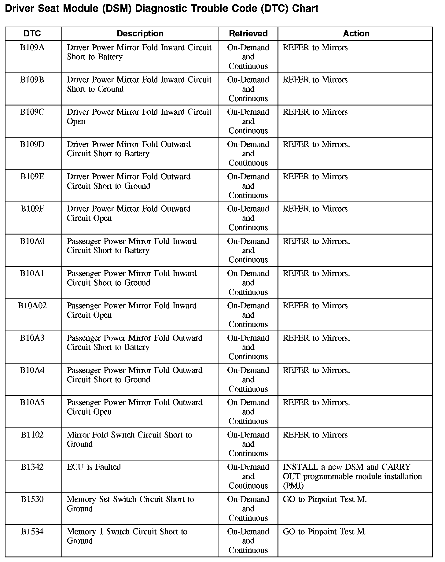 Driver Seat Module (DSM) Diagnostic Trouble Code (DTC) Chart