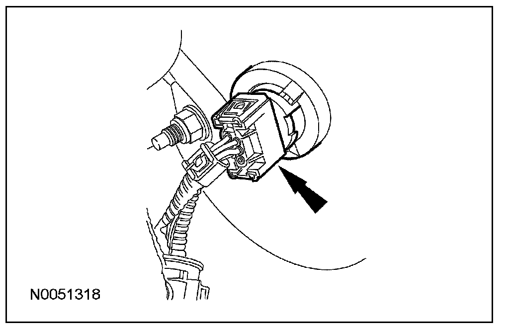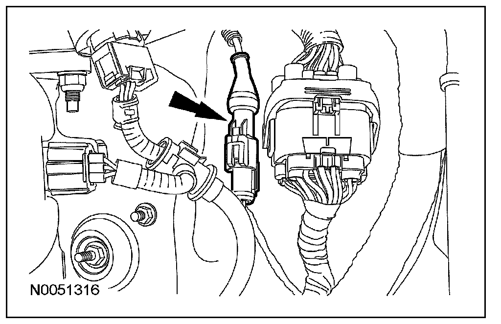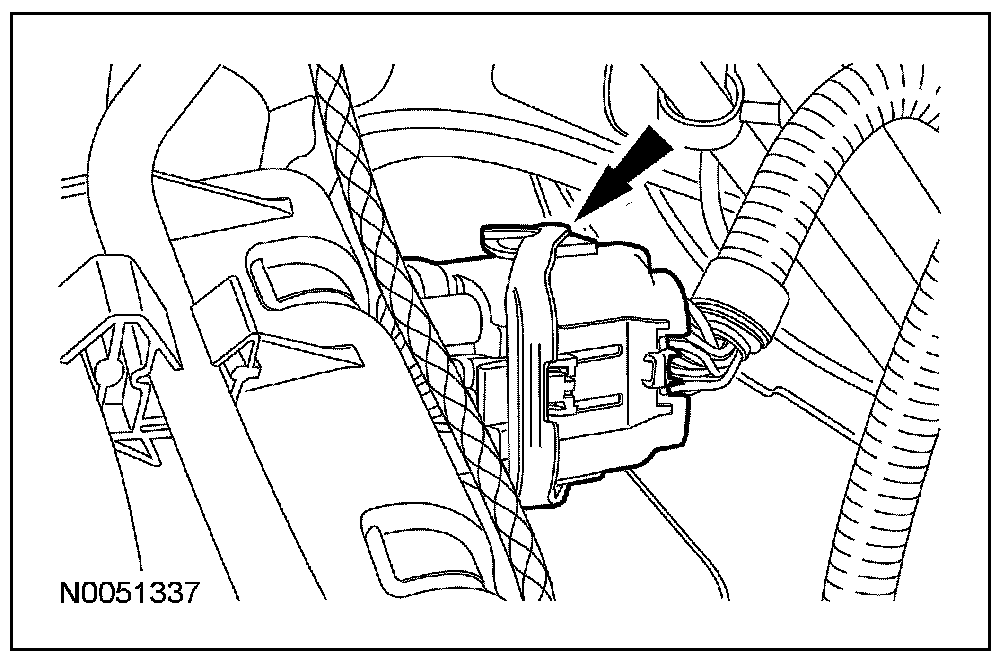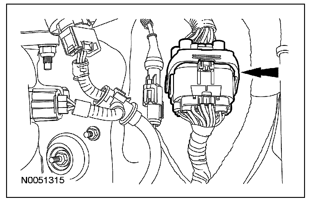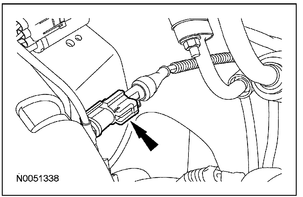 59. Disconnect the transmission electrical connector from the harness and the clip on the A/C line.