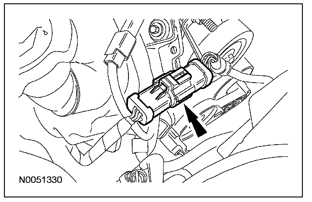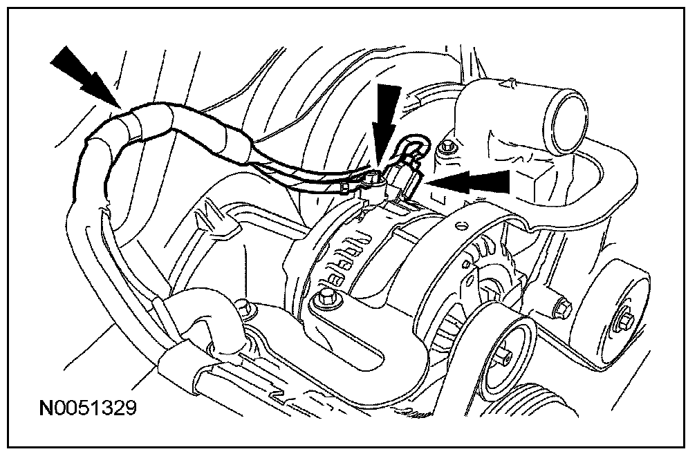 51. Remove the nut and disconnect the electrical connector from the generator wiring harness and remove from the retainer.