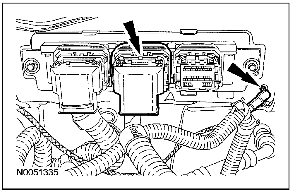 57. Disconnect the engine electrical connector from the PCM and remove the retainer from the bulkhead.