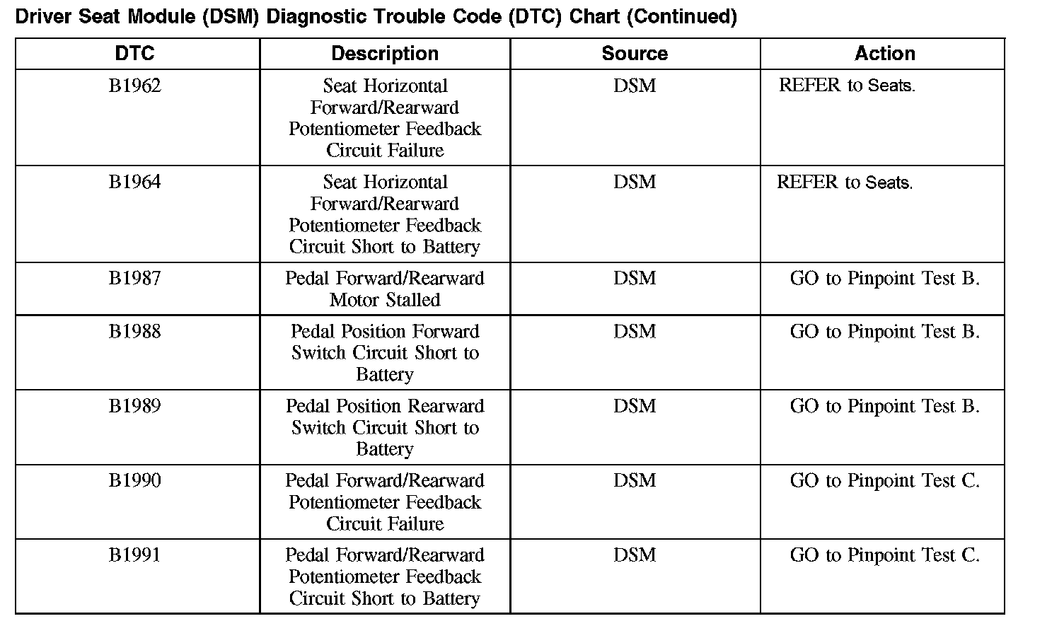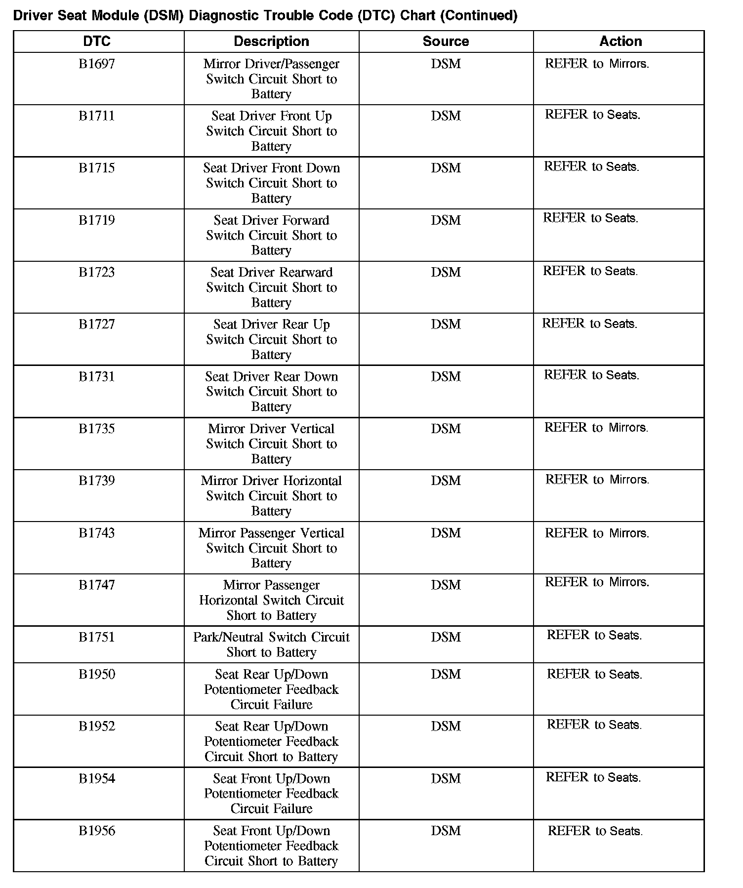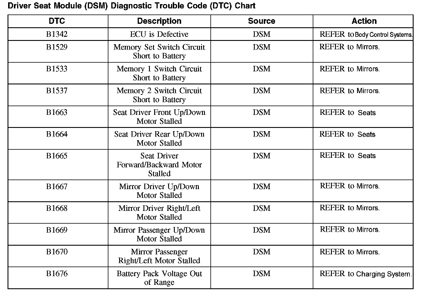 Driver Seat Module (DSM) Diagnostic Trouble Code (DTC) Chart
