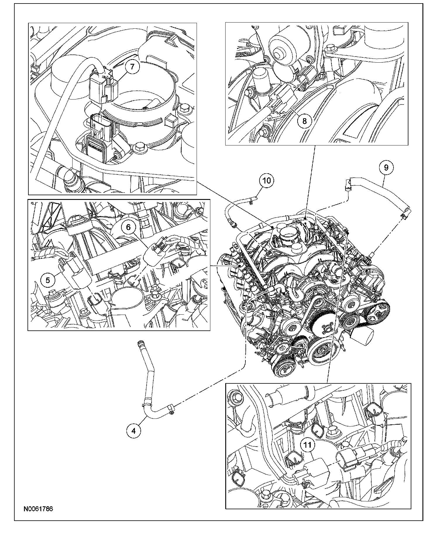 7. Disconnect the quick connect coupling and remove the evaporative emissions system (EVAP) hose from the intake manifold. For additional information, refer to Fuel Delivery and Air Induction.