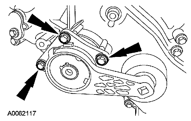 33. Remove the bolts, the coolant pump pulley and the 3 accessory drive belt idler pulleys.