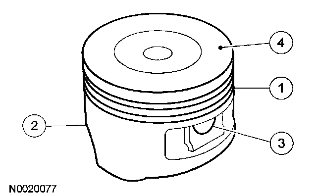 1. Clean and inspect the (1) ring lands, (2) skirts, (3) pin bosses and the (4) tops of the pistons. If wear marks, scores or glazing is found on the piston skirt, check for a bent or twisted connecting rod.