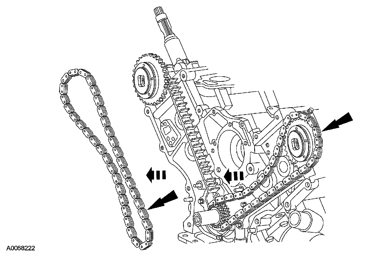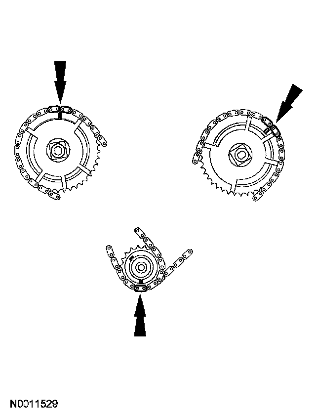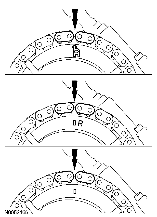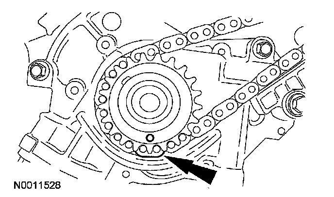 Position the RH timing chain on the VCT phaser sprocket with the timing mark positioned between the 2 copper (marked) chain links.