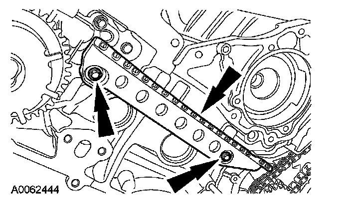 14. NOTE: The LH timing chain tensioner arm has a bump near the dowel hole for identification.