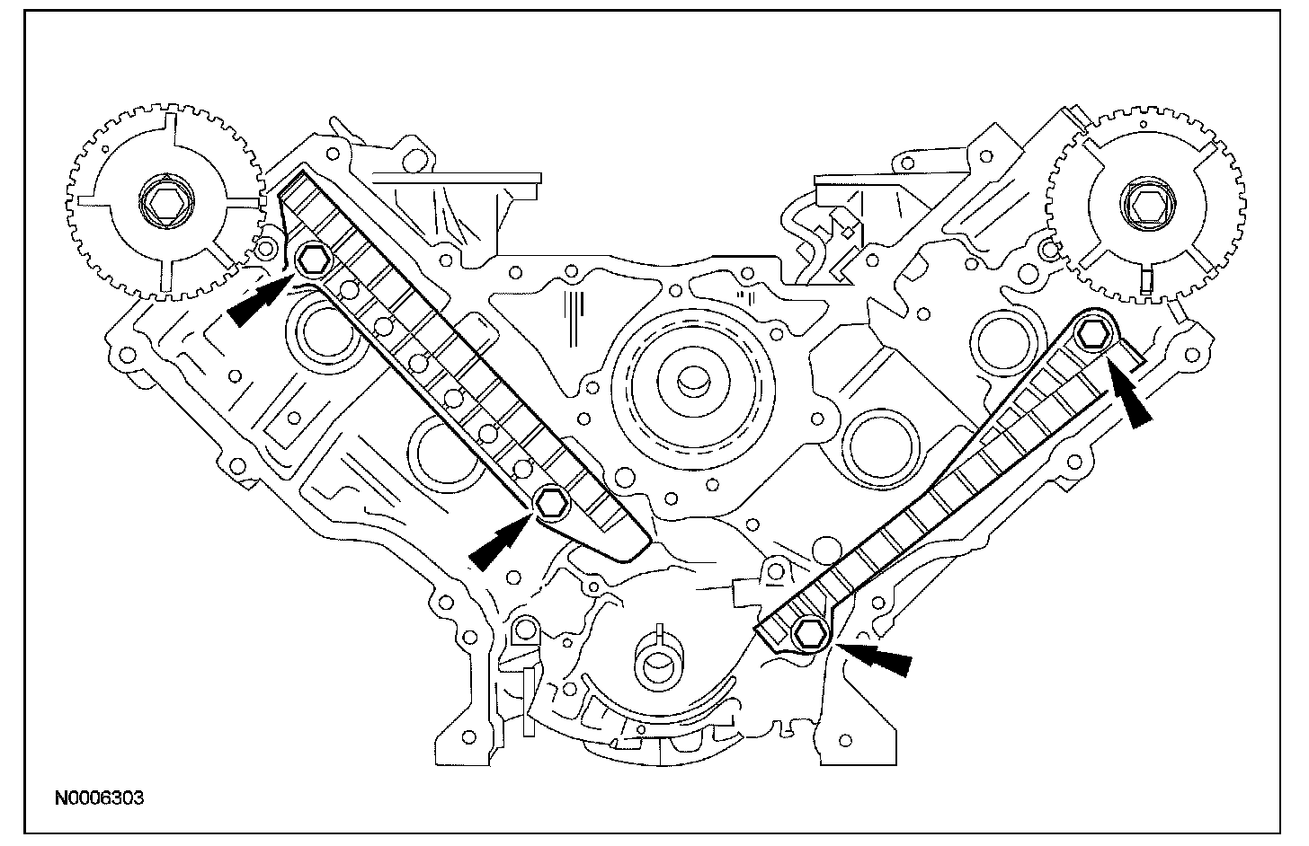 11. Install the 4 bolts and the LH and RH timing chain guides.