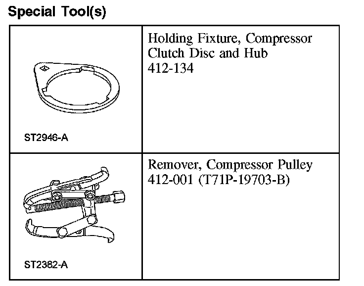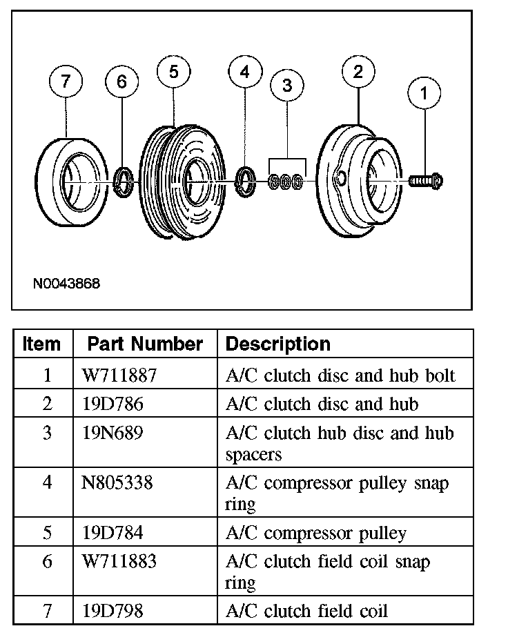 NOTE: The A/C clutch components should be reused unless obvious signs of damage are found. If excessive grooving is found, a new A/C clutch disc and hub and a new A/C compressor pulley must be installed together. Otherwise, each component can be installed individually where needed.