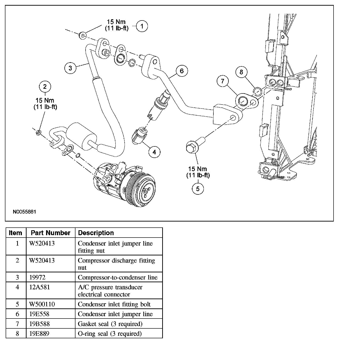 5. If removing the condenser inlet jumper line, remove the RH headlamp assembly.