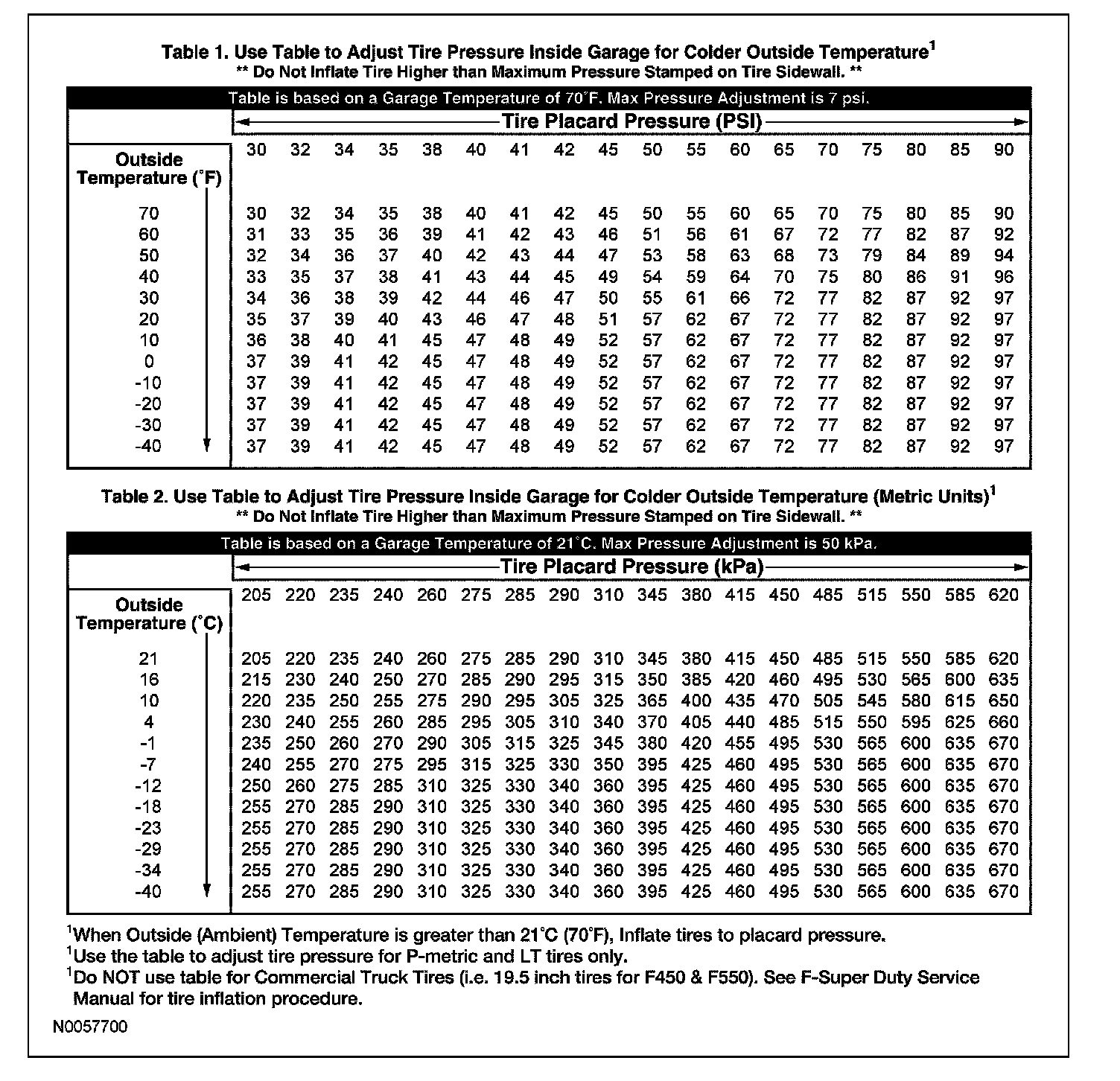 As the ambient temperature decreases by 6°C (10°F), tire pressure decreases 7 kPa (1 psi). Adjust the tire pressure by 7 kPa (1 psi) for each 6°C (10°F) ambient temperature drop as necessary to keep the tire at the specified vehicle certification label pressure. Refer to the following tables to adjust the tire pressure indoors for colder outside temperatures.