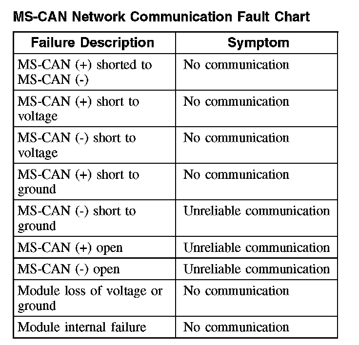 The fault chart describes the specific MS-CAN network failures and their resulting symptom: