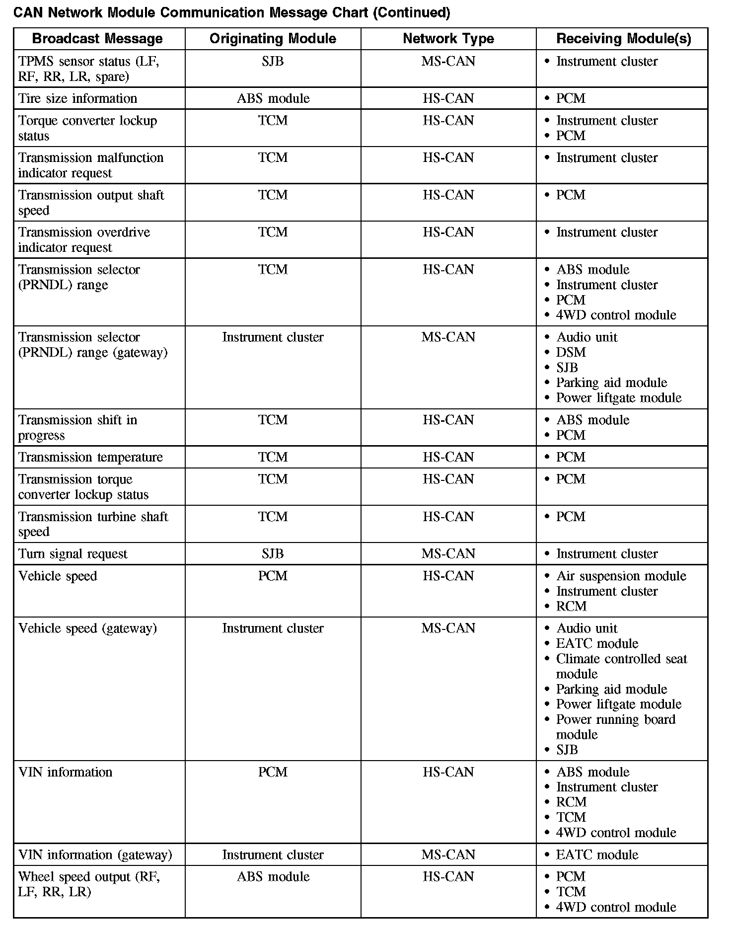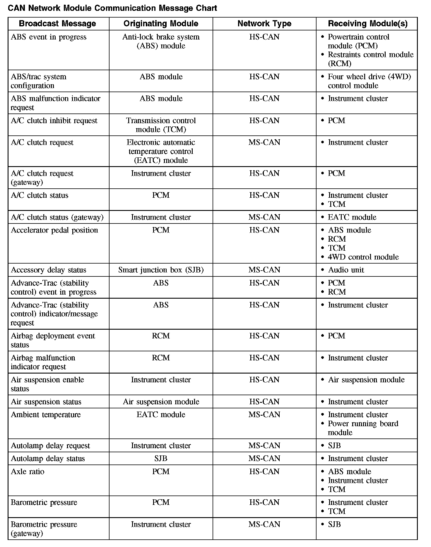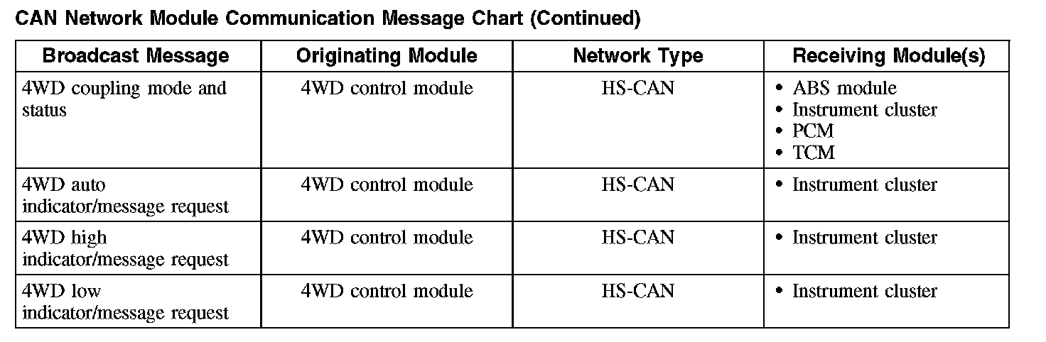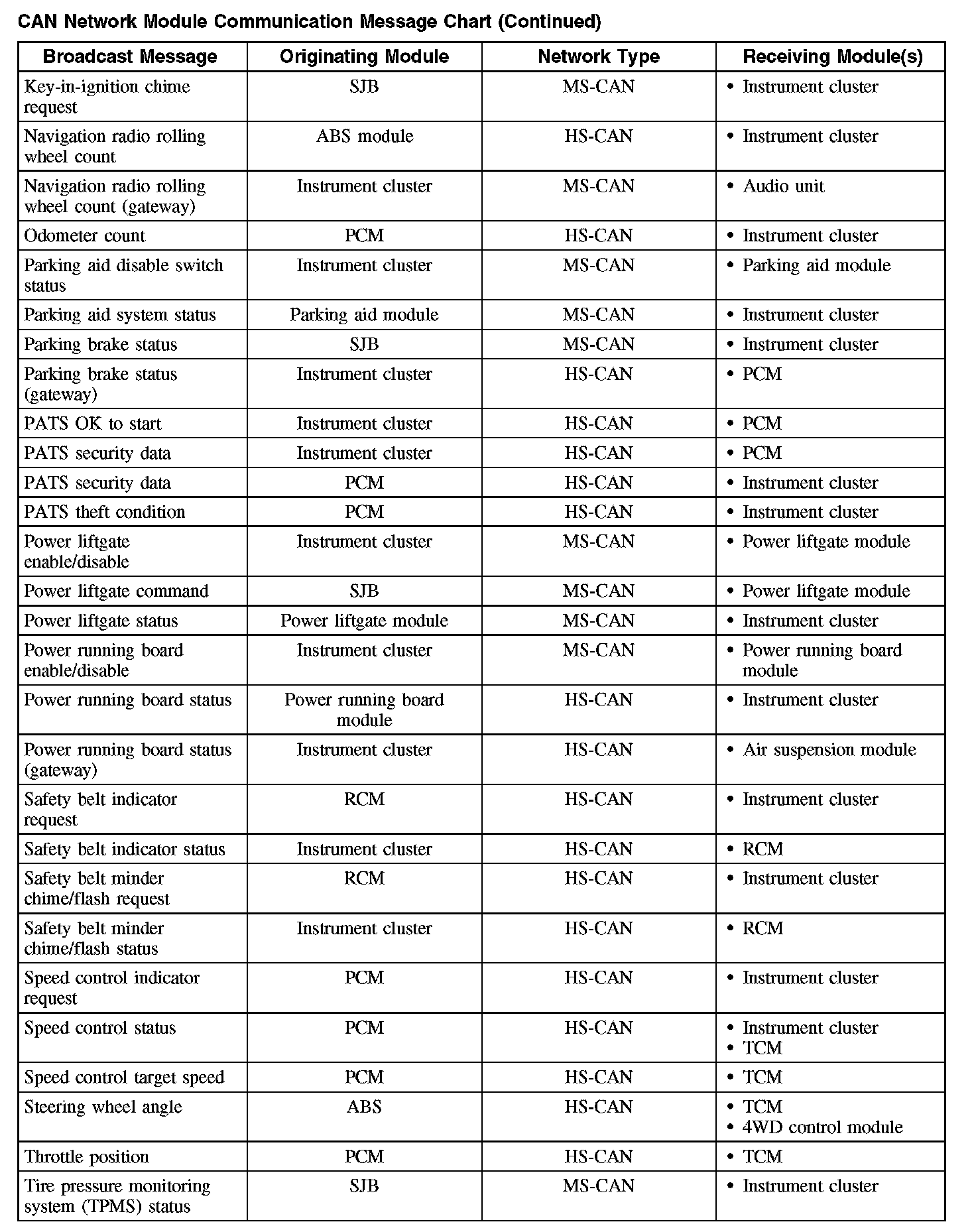 The chart describes the specific CAN network messages broadcast by each module, and the module(s) that receive the message: