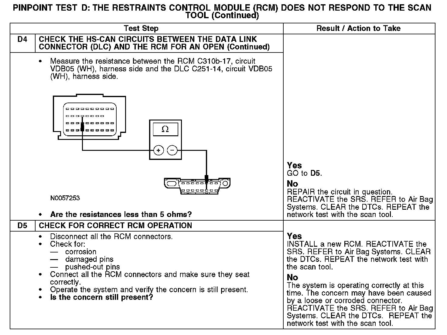 PINPOINT TEST D: THE RESTRAINTS CONTROL MODULE (RCM) DOES NOT RESPOND TO THE SCAN TOOLD1-D2: