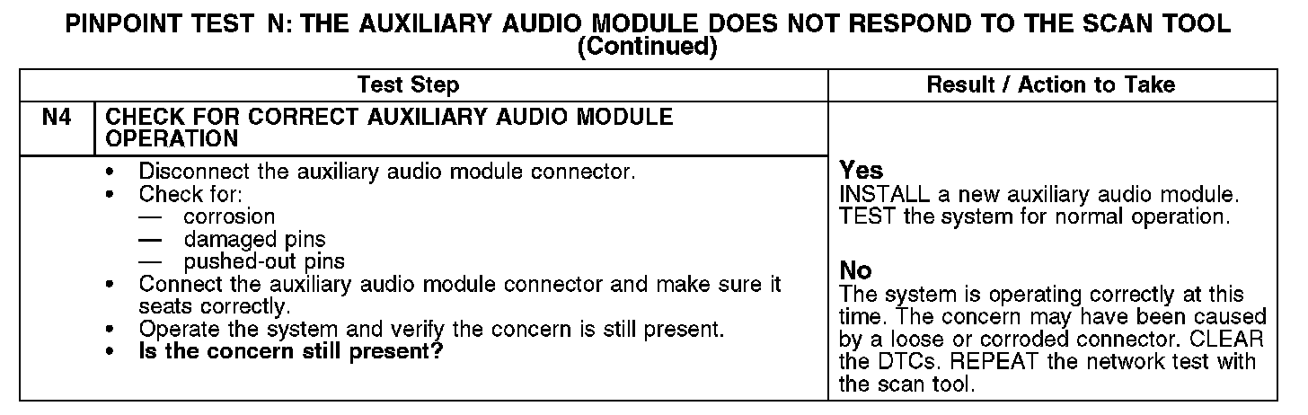 PINPOINT TEST N: THE AUXILIARY AUDIO MODULE DOES NOT RESPOND TO THE SCAN TOOLN1-N2: