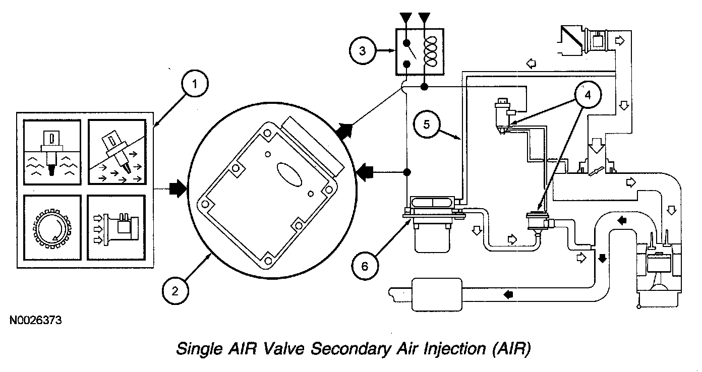 2. When the engine is started, the strategy determines when to enable the secondary AIR pump. The PCM signals the AIR relay and the AIR bypass solenoid, after a 5 to 15 second delay, to begin system operation. Once the catalyst is lit-off, the PCM then signals the AIR relay to stop secondary AIR pump operation and to close the AIR bypass solenoid from supplying vacuum to the AIR diverter valve.