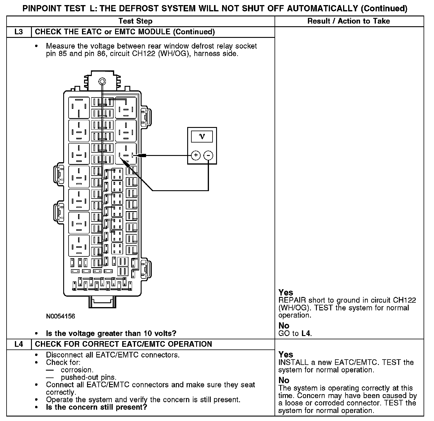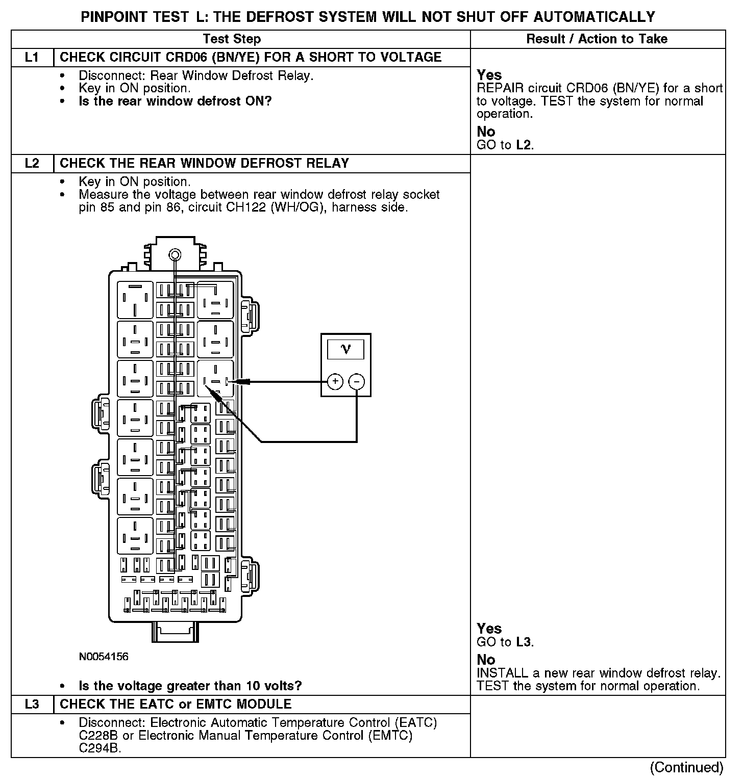 During normal operation, the EATC or EMTC activates the rear window defrost relay by providing grounding the relay coil through circuit CH122 (WH/OG). When the defrost relay is activated, power is supplied from the rear window defrost relay through circuit CRD06 (BN/YE) to the rear window defrost grid. Ground is supplied to the rear window defrost grid through circuit GD150 (BK/WH).