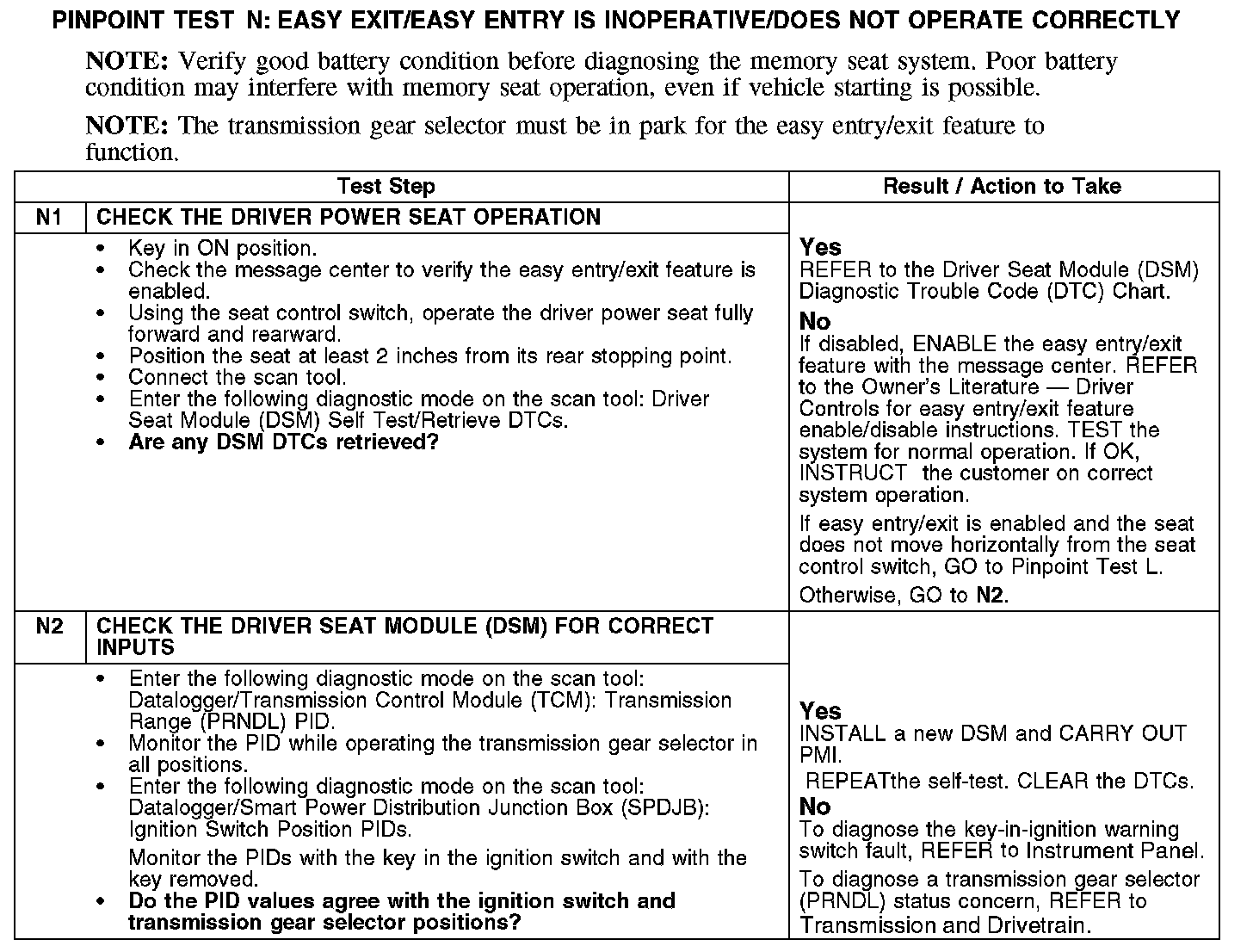 PINPOINT TEST N: EASY EXIT/EASY ENTRY IS INOPERATIVE/DOES NOT OPERATE CORRECTLYN1-N2: