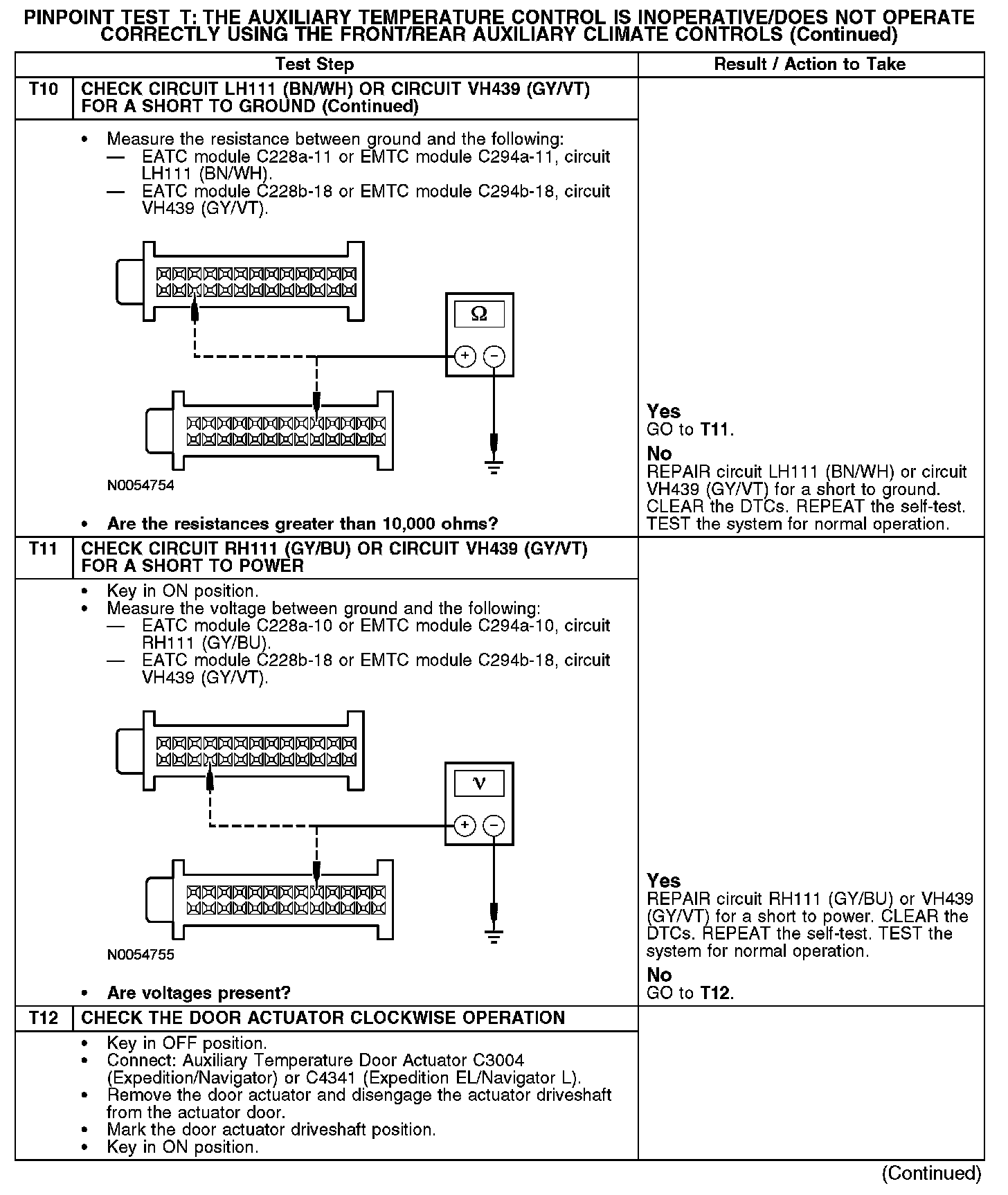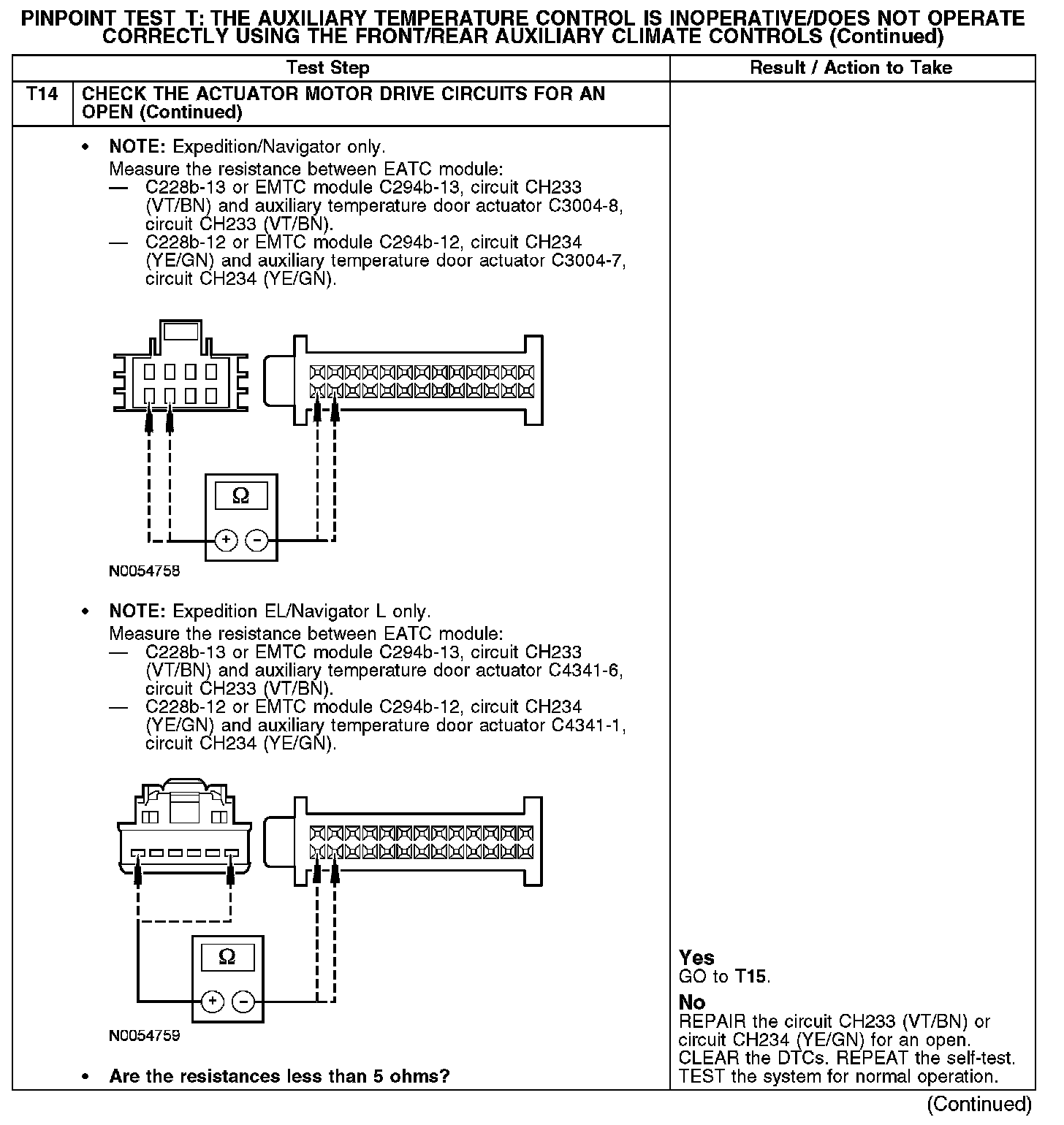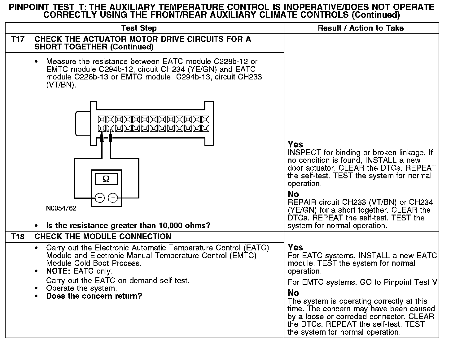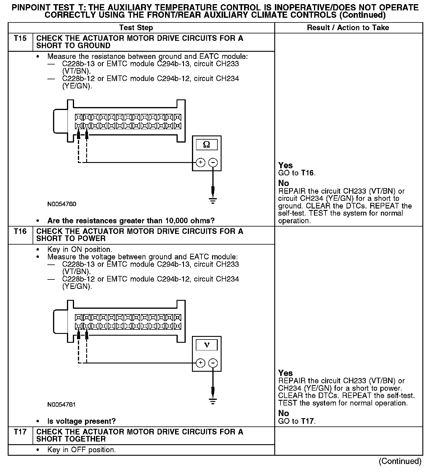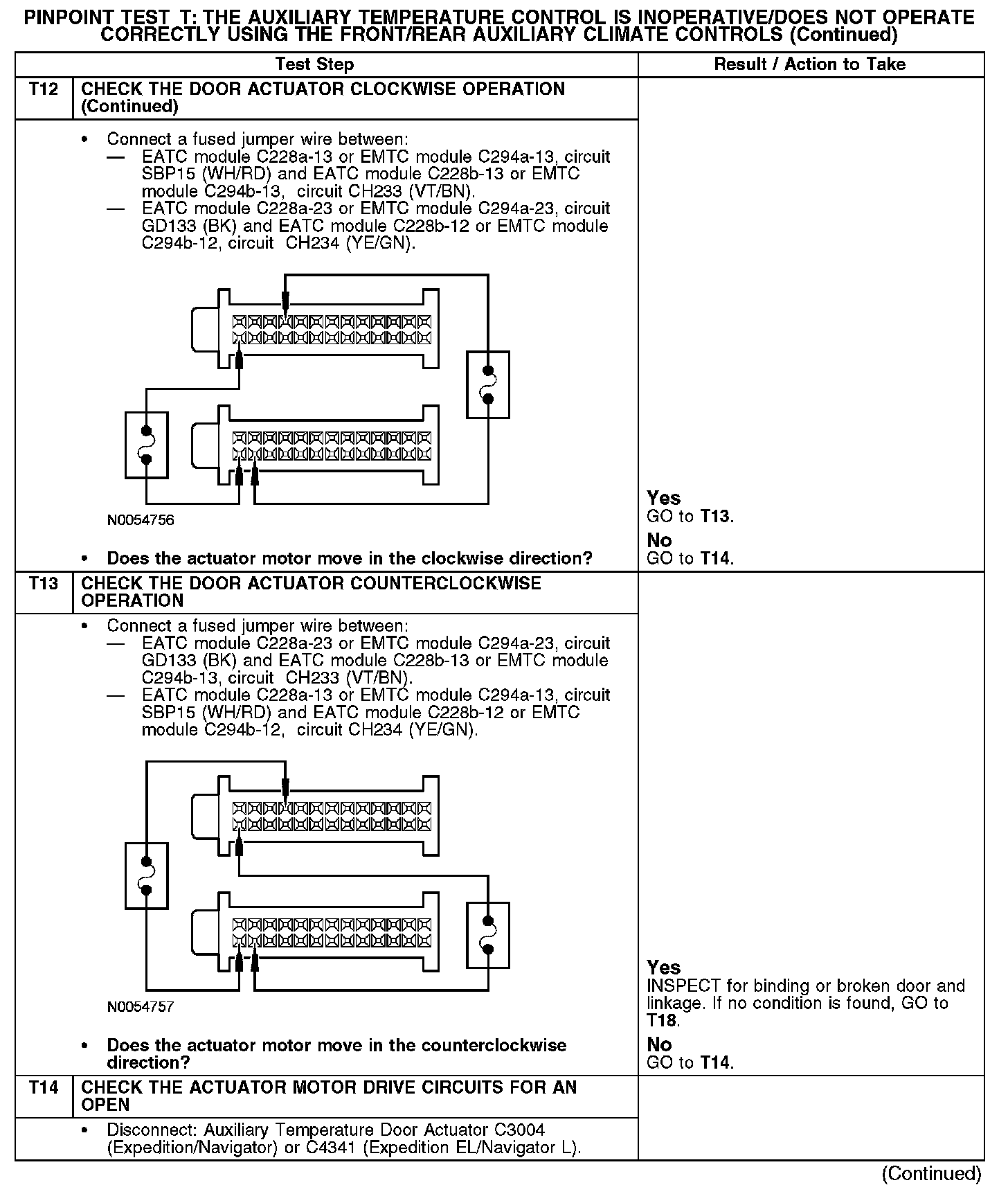 Under normal operation, to rotate the temperature door actuator clockwise, the electronic manual temperature control (EMTC) or electronic automatic temperature control (EATC) module supplies voltage to the auxiliary temperature door actuator through the circuit CH233 (VT/BN), and supplies ground through circuit CH234 (YE/GN). To rotate the auxiliary temperature door actuator counterclockwise, the EMTC or EATC module reverses the voltage and ground circuits.