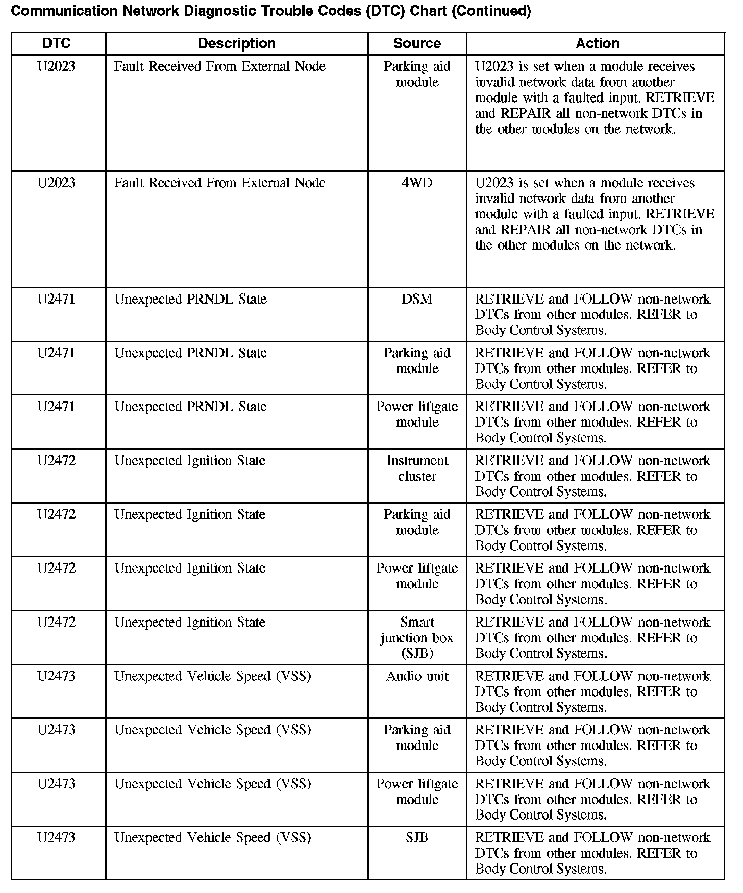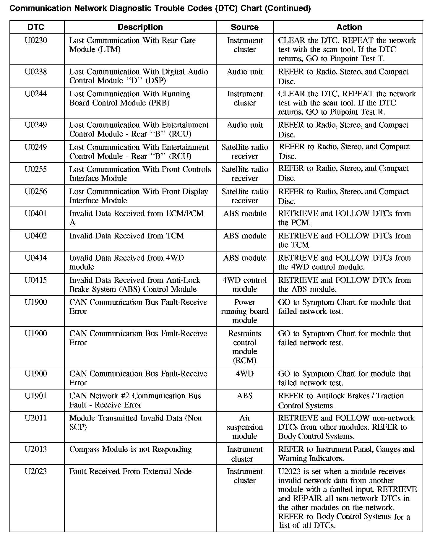 Communication Network Diagnostic Trouble Codes (DTC) Chart