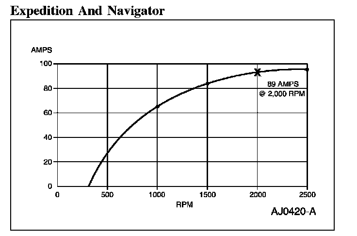 4. With the engine running at approximately 2,000 rpm, adjust the tester load bank to determine the output of the generator. Generator output should be greater than the graph shown. If not, refer to the pinpoint test or GO to Symptom Chart. Pinpoint Tests Symptom Related Diagnostic Procedures