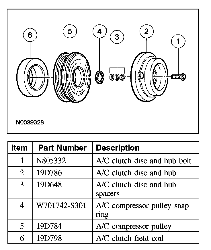 NOTE: If installing a new A/C compressor, the A/C clutch components should be reused unless obvious signs of damage are found. If excessive grooving is found, a new A/C clutch disc and hub and A/C compressor pulley must be installed together. Otherwise, each component can be installed individually where needed.