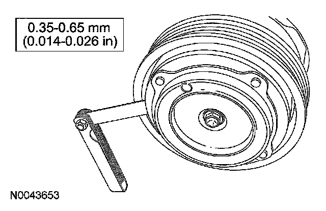 9. Measure and adjust the clutch air gap by removing or adding A/C clutch hub spacers.