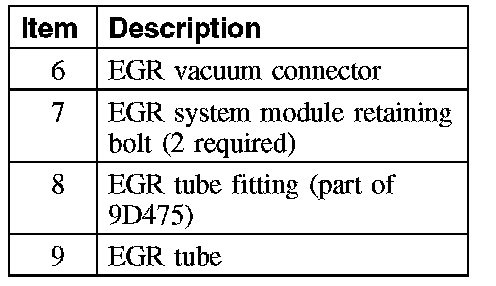 6. CAUTION: Do not use metal scrapers, wire brushes, power abrasive discs or other abrasive means to clean the sealing surfaces. These tools cause scratches and gouges that make leak paths. Use a plastic scraping tool to remove all traces of the EGR system module gasket.