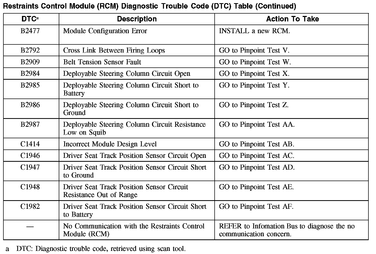 Restraints Control Module (RCM) Diagnostic Trouble Code (DTC) Table