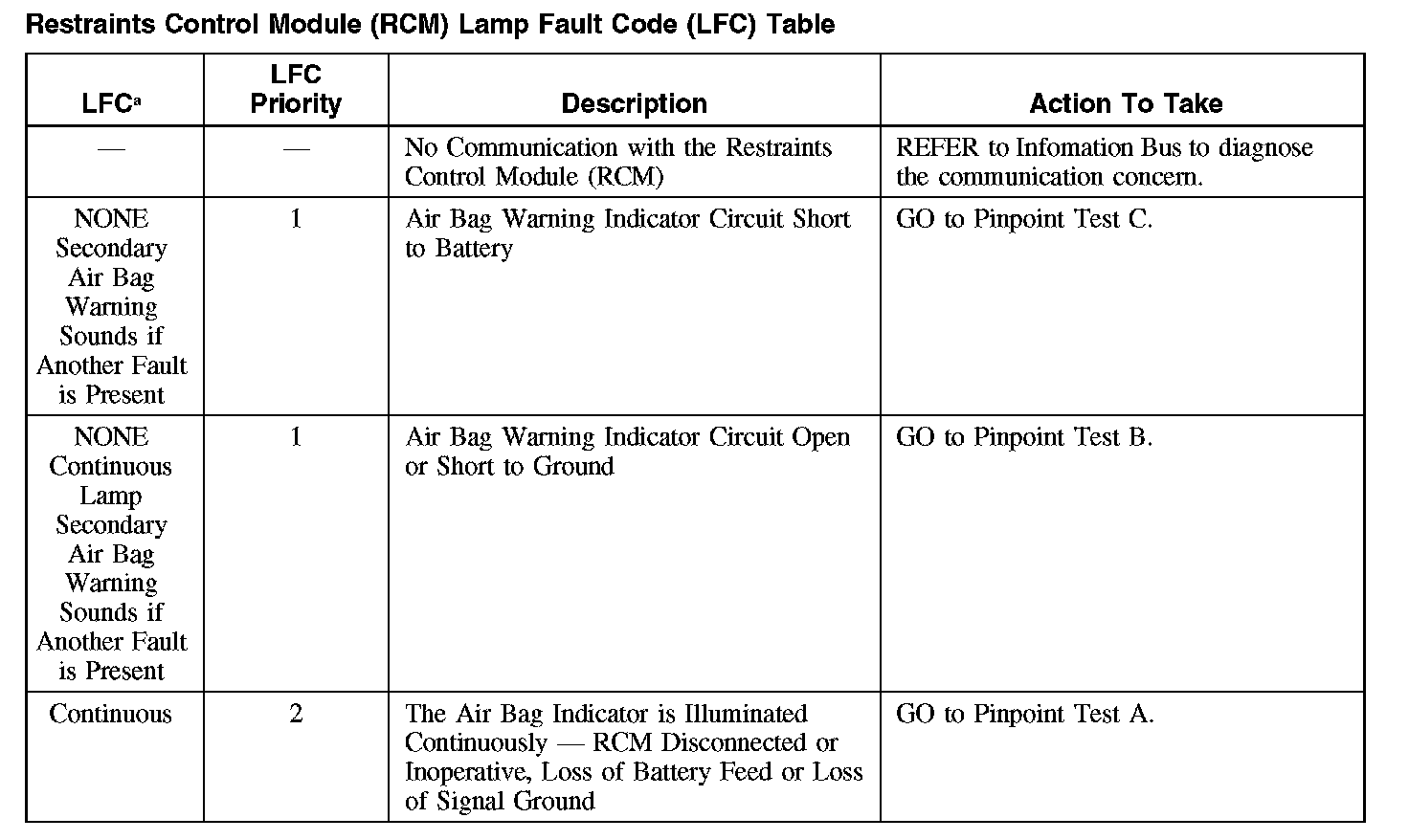 Restraints Control Module (RCM) Lamp Fault Code (LFC) Table
