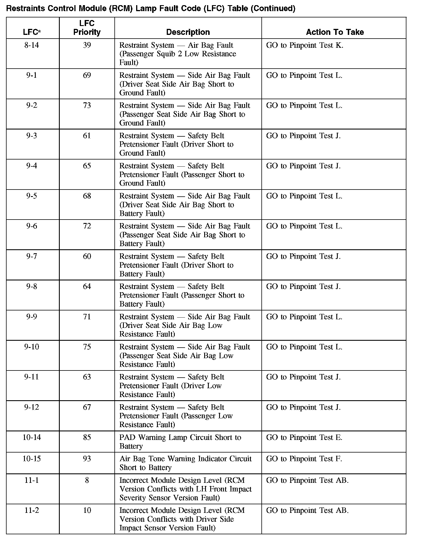 RESTRAINTS CONTROL MODULE (RCM) LAMP FAULT CODE (LFC) TABLERestraints Control Module (RCM) Lamp Fault Code (LFC) Table (Part 1):