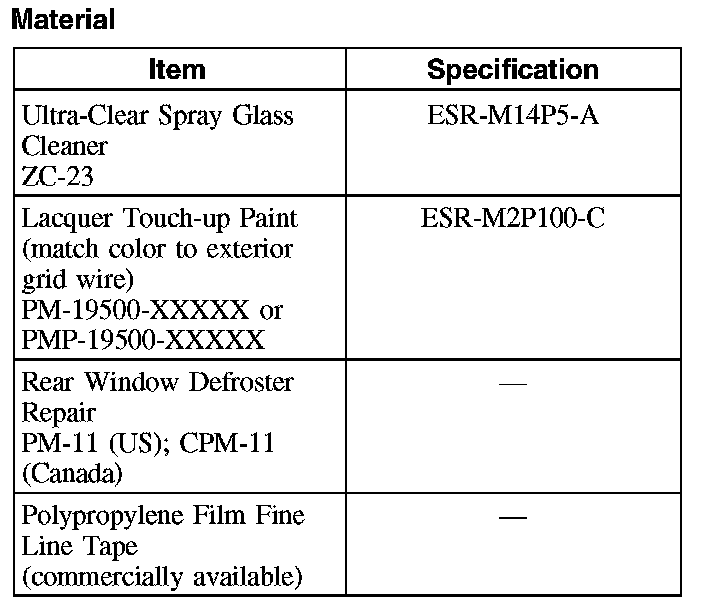 - If the brown color under the grid line is damaged or missing (this is very rare), it is necessary to apply acrylic lacquer touch-up paint for color match. This paint must meet specification ESR-M2P100-C and should be applied to the glass prior to applying the rear window defroster repair compound.