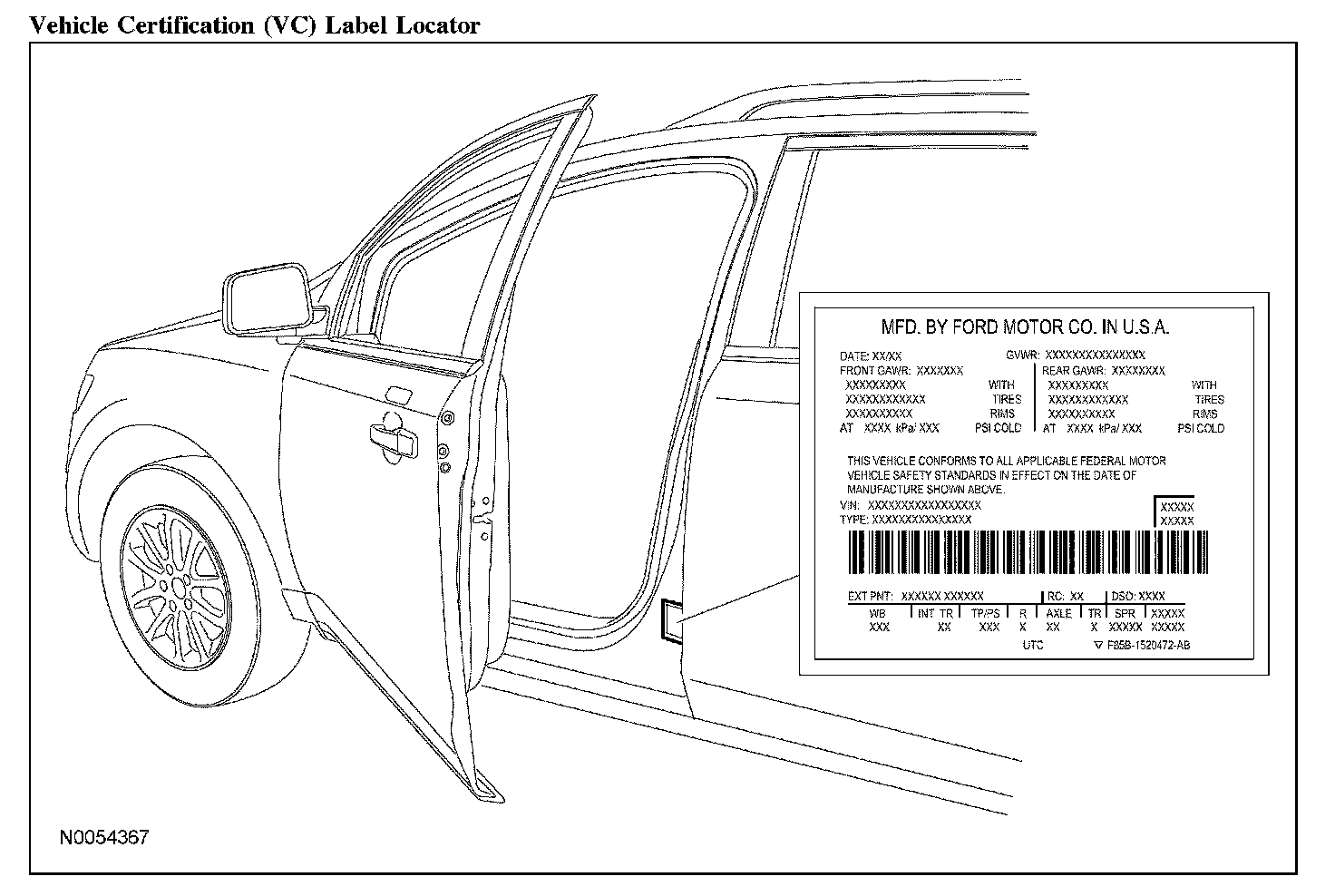 The upper portion of the VC label contains the manufacturer's name, the month and year of manufacture, the certification statement and the VIN. It also includes the GVWR. The VC label is located on the left-hand door jamb.