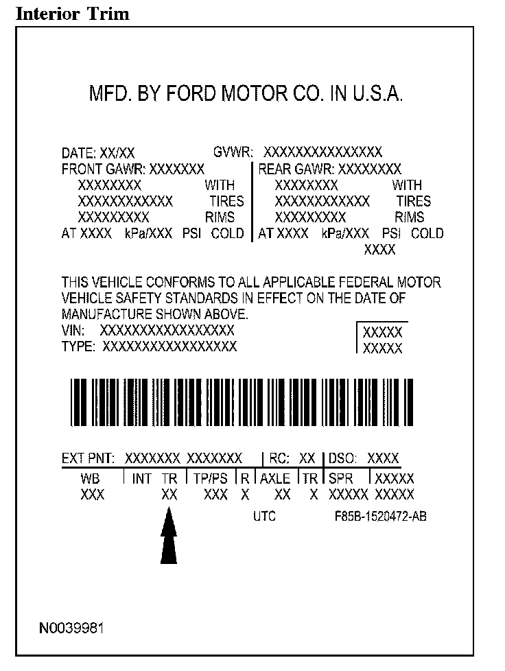 Interior trim codes are listed as a 2-part code. The first character identifies the interior trim type. The second character identifies the interior trim color.